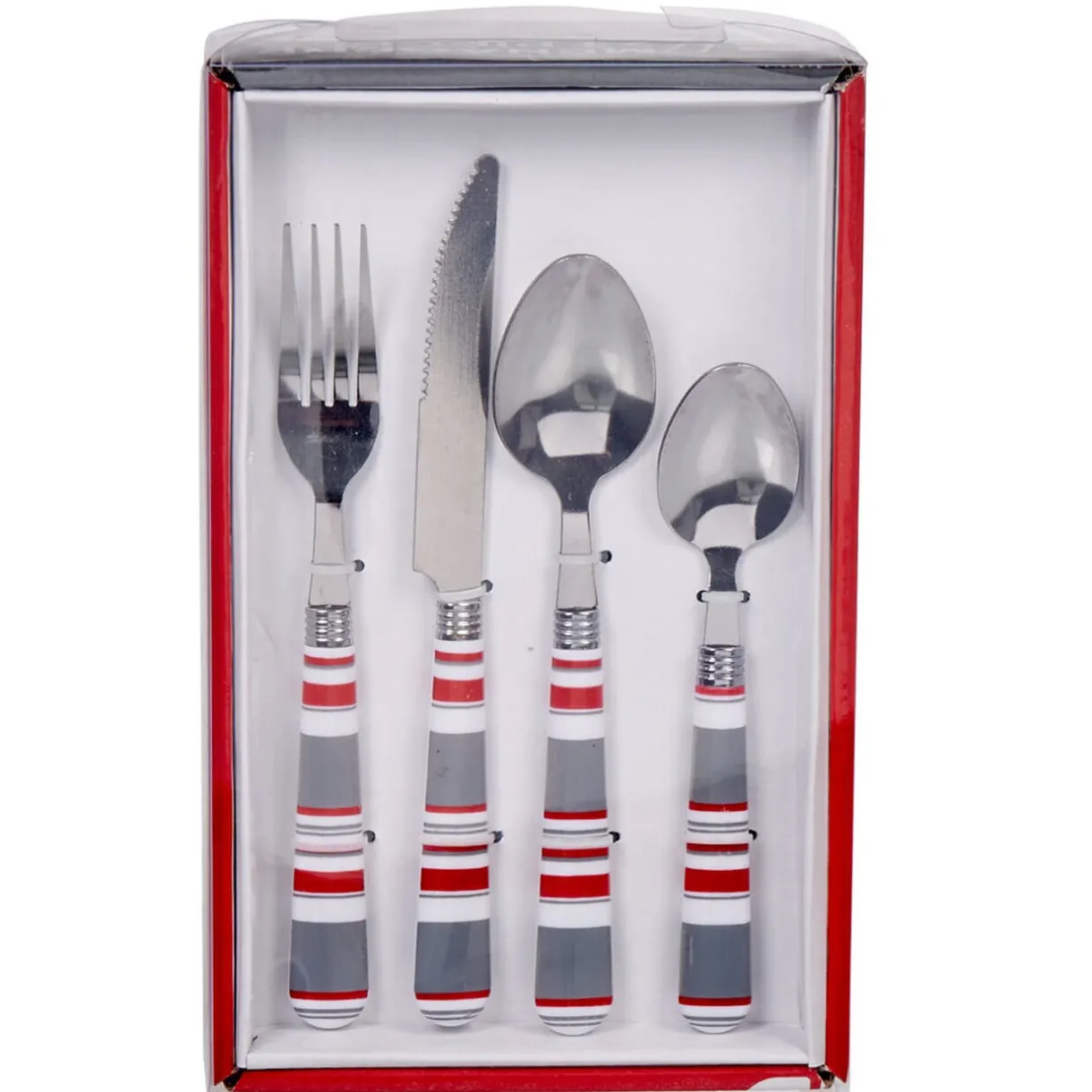 Ajoutez un peu de couleurs à votre table avec cette ménagère de 24 pièces avec 4 fourchettes, 4 couteaux ronds, 4 grandes cuillères et 4 petites cuillères à rayures bayadère.