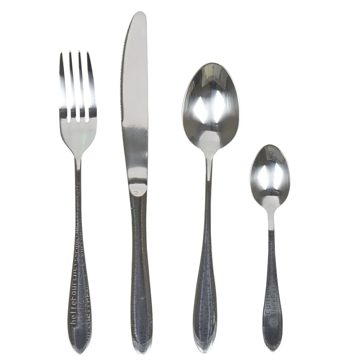 Ajoutez un peu de magie à votre table avec cette ménagère de 24 pièces avec 4 fourchettes, 4 couteaux ronds, 4 grandes cuillères et 4 petites cuillères argentés.