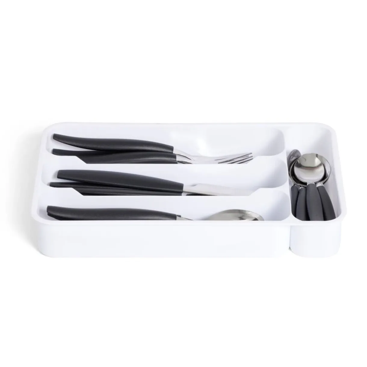 Un range-couverts en plastique blanc, spécialement conçu pour cette ménagère, est inclus pour un stockage facilité et une meilleure organisation.