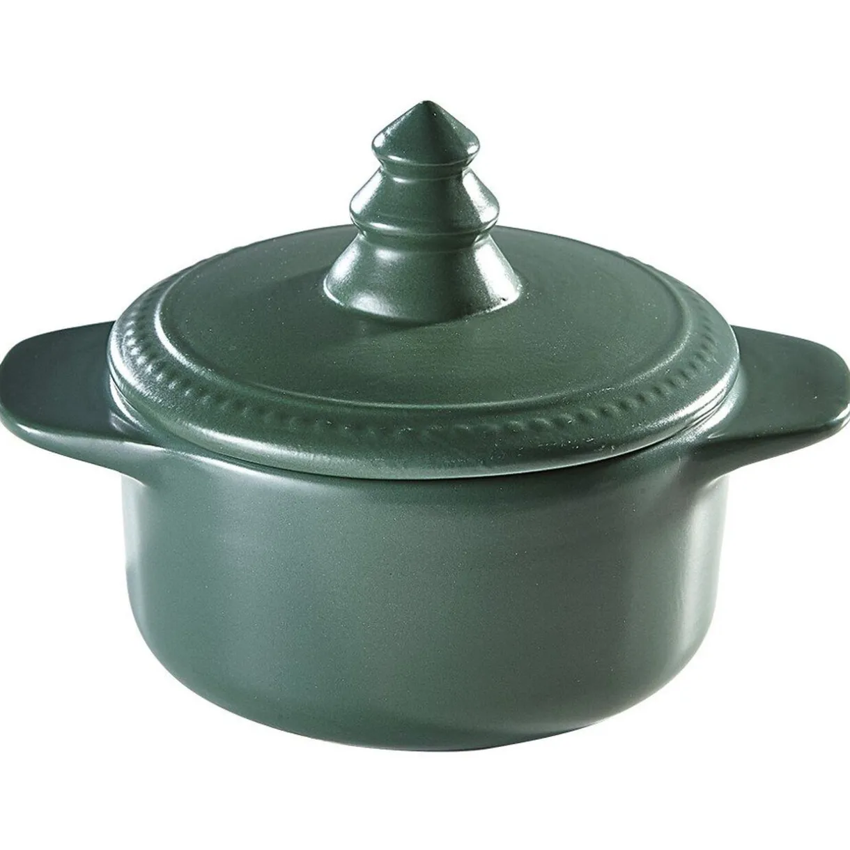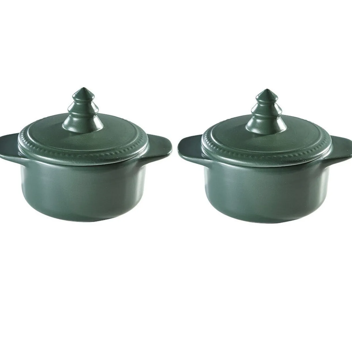 Lot de deux minis cocottes vertes avec un sapin en guise de poignée sur le couvercle. Idéales pour préparer de délicieux petits plats individuels à l’occasion des fêtes de fin d’années.