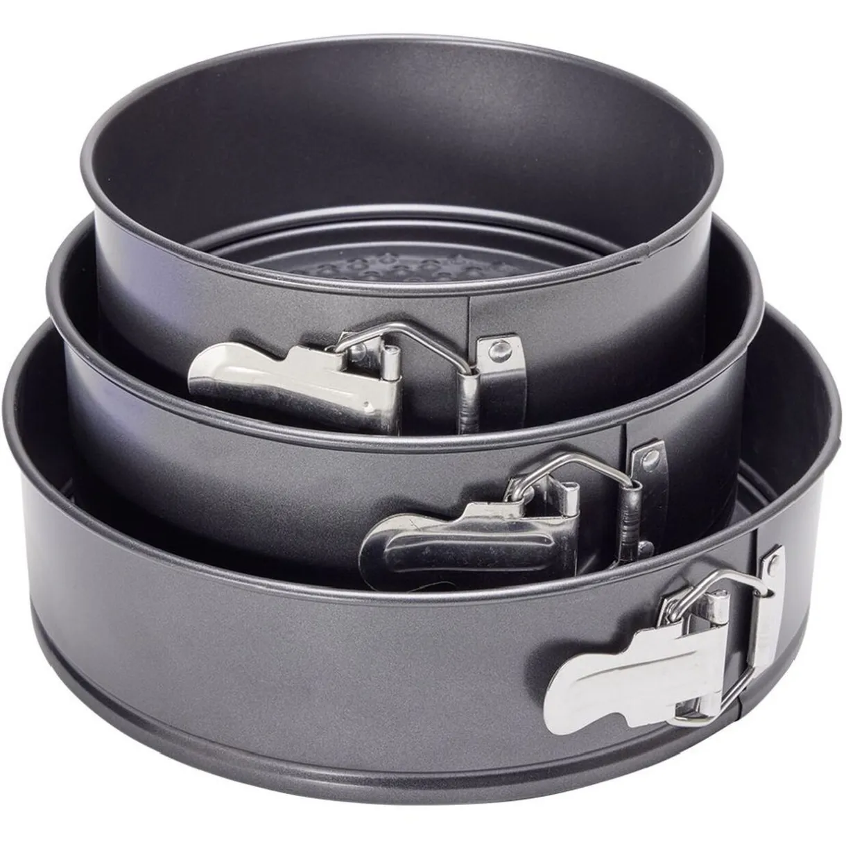 Lot de 3 moules à gâteau en métal avec système d’ouverture/fermeture à charnière pour un démoulage facile.