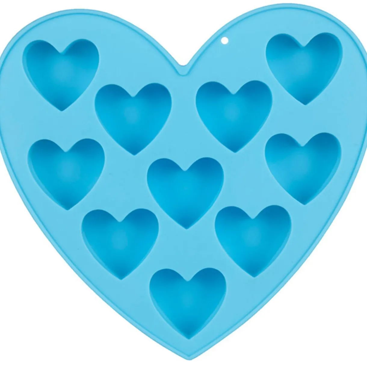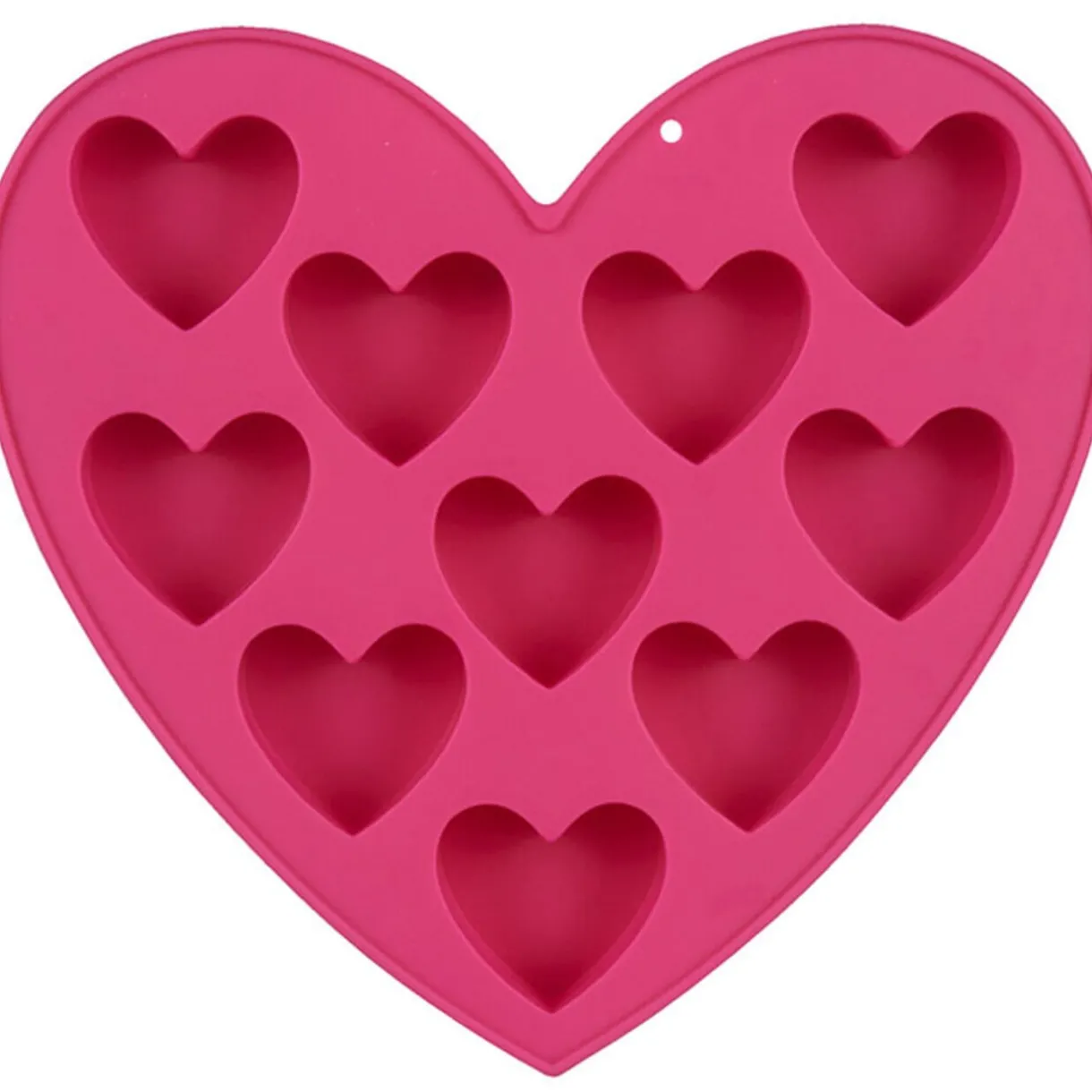 Moule en silicone pour 10 chocolats en forme de coeur, planche dim. 15,5x15x1,8 cm, coeur dim. 3x3x1,5 cm. Diff. coloris, disponibilité selon arrivage.