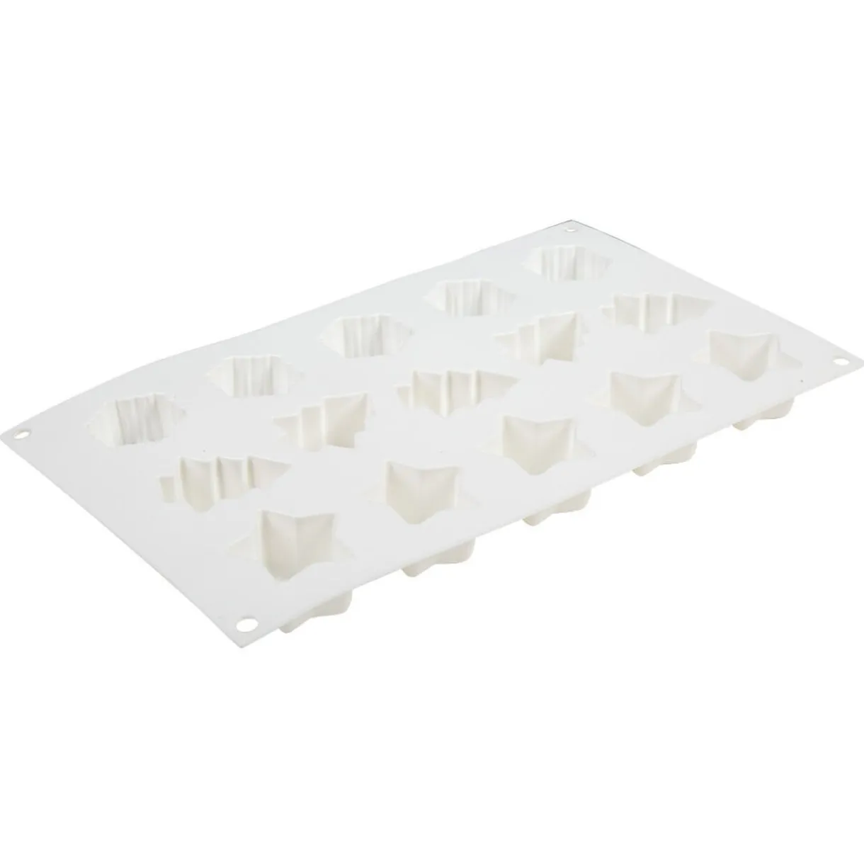 Moule en silicone avec 15 empreintes de formes différentes: sapins, étoiles, flocons.