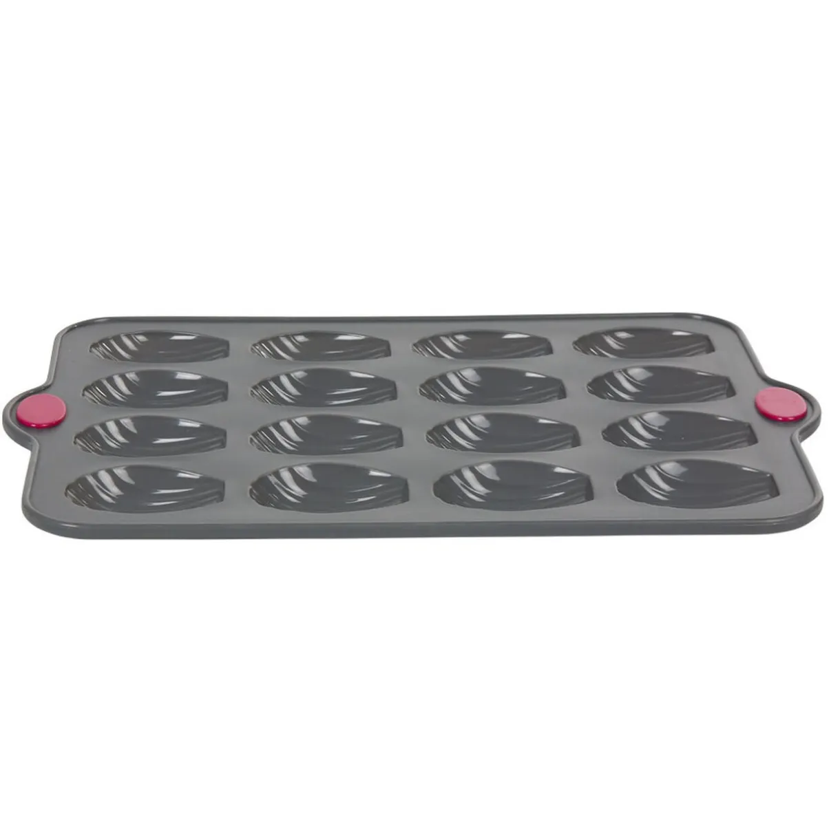 Moule en silicone gris pour la cuisson de 16 madeleines avec armature rigide en acier pour une meilleure stabilité et prise en main.