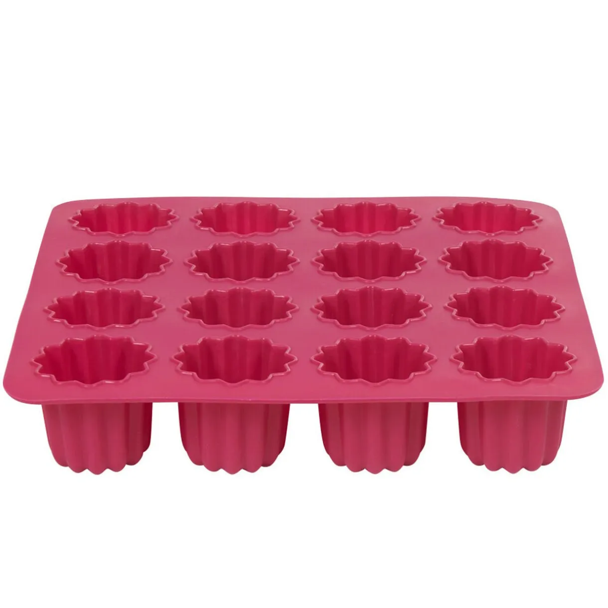 Moule carré en silicone de couleur rose pour la cuisson de 16 délicieux cannelés.