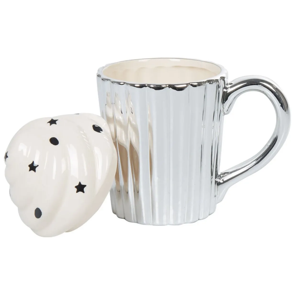 Optez pour ce joli mug en faïence gris argenté avec couvercle blanc design cupcake, idéal pour vos pauses douceur.
