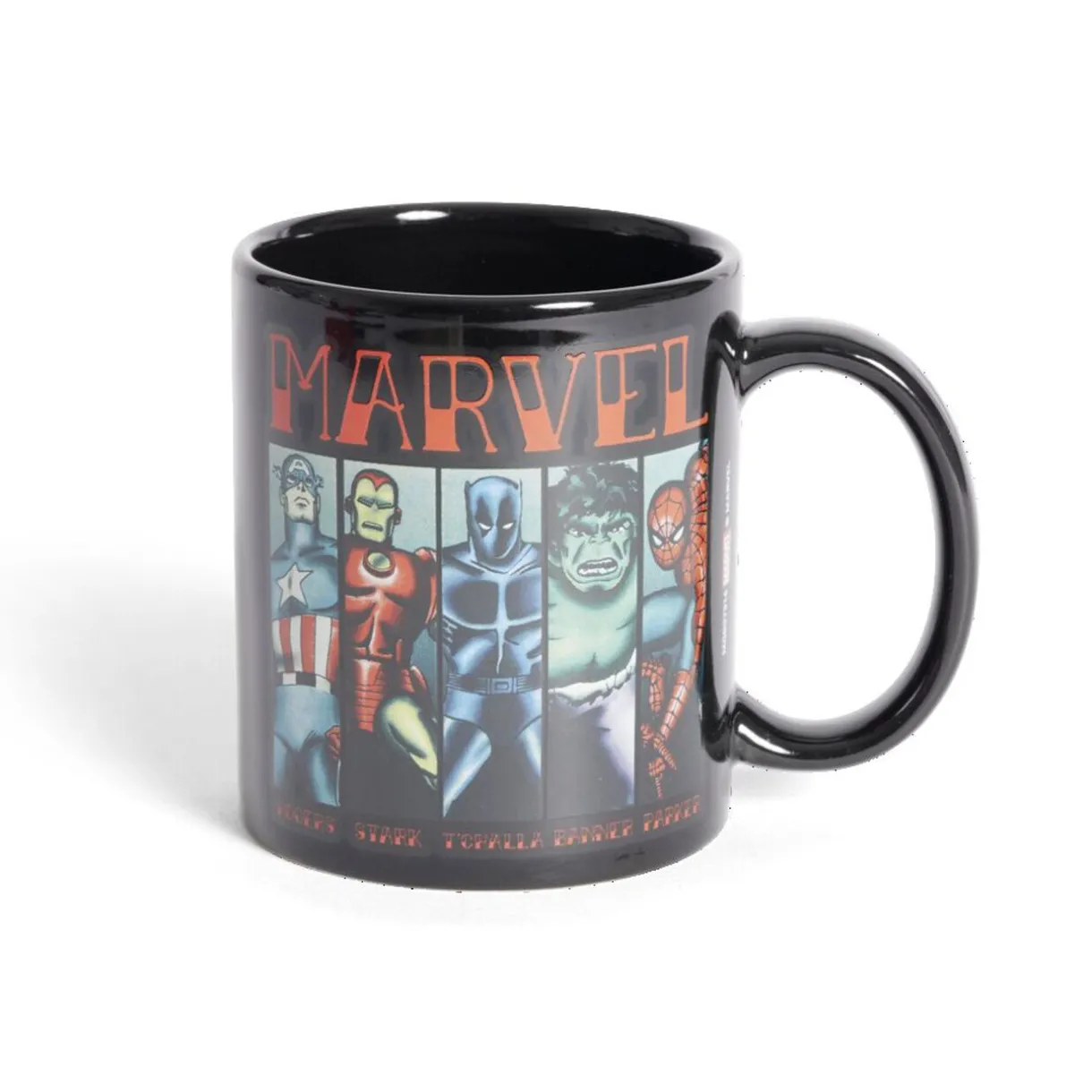 Ce mug Marvel noir avec inscription rouge présente les personnages emblématiques de l’univers des super-héros.
