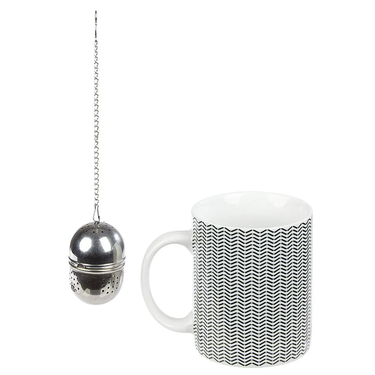 Mug en porcelaine blanche et motifs zig zag noir avec sa boule à thé en inox.