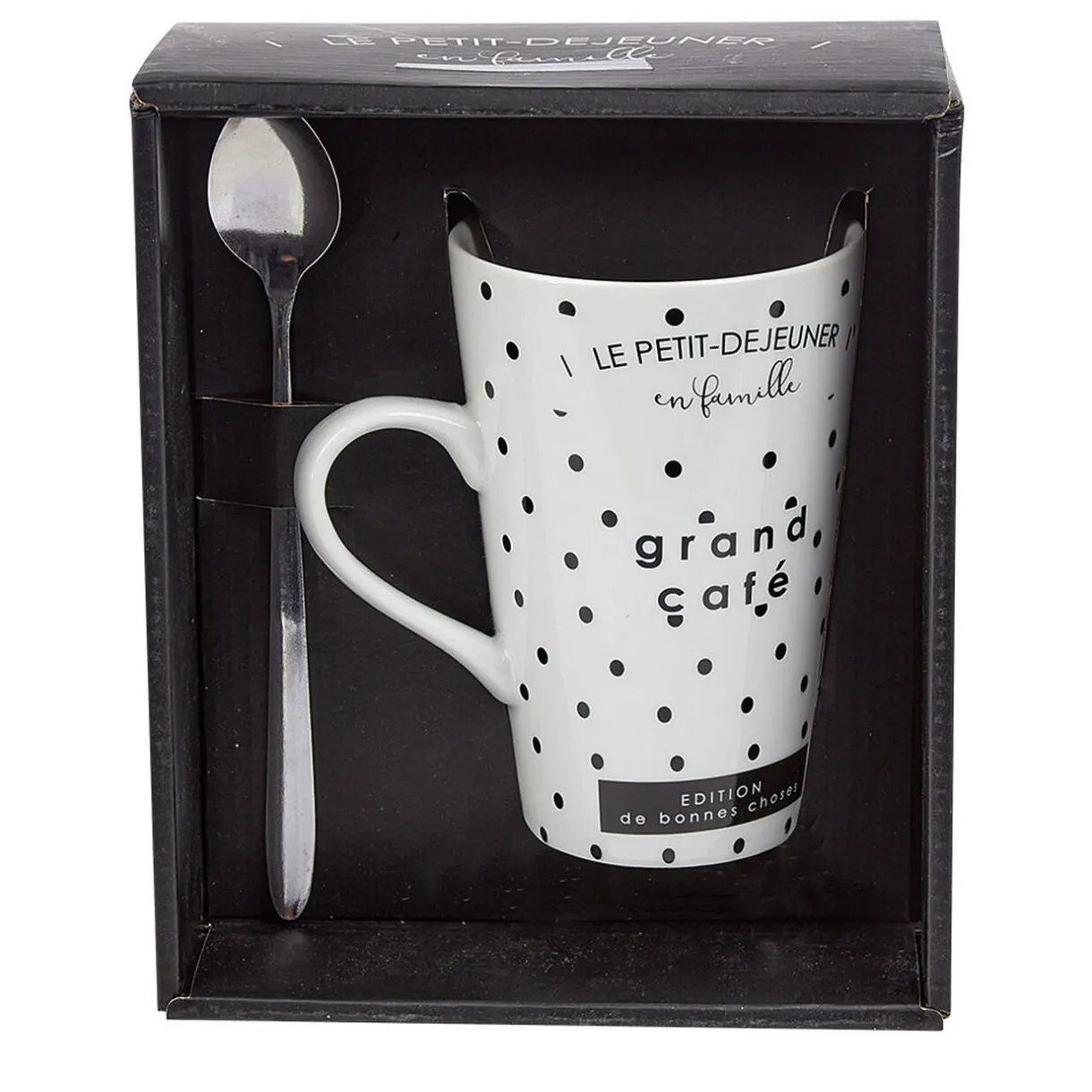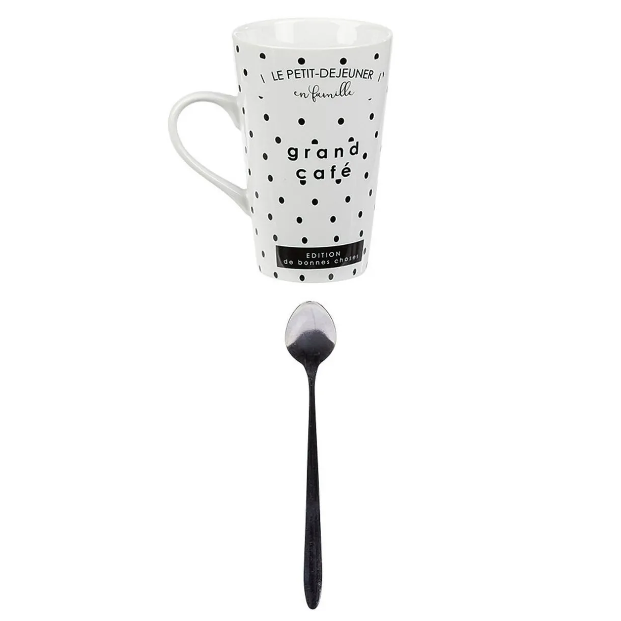 Mug design Grand café en porcelaine blanche et motif pois noirs. Une tasse toute mignonne livrée dans un coffret avec sa cuillère adaptée pour touiller et boire sa boisson chaude préférée avec style!