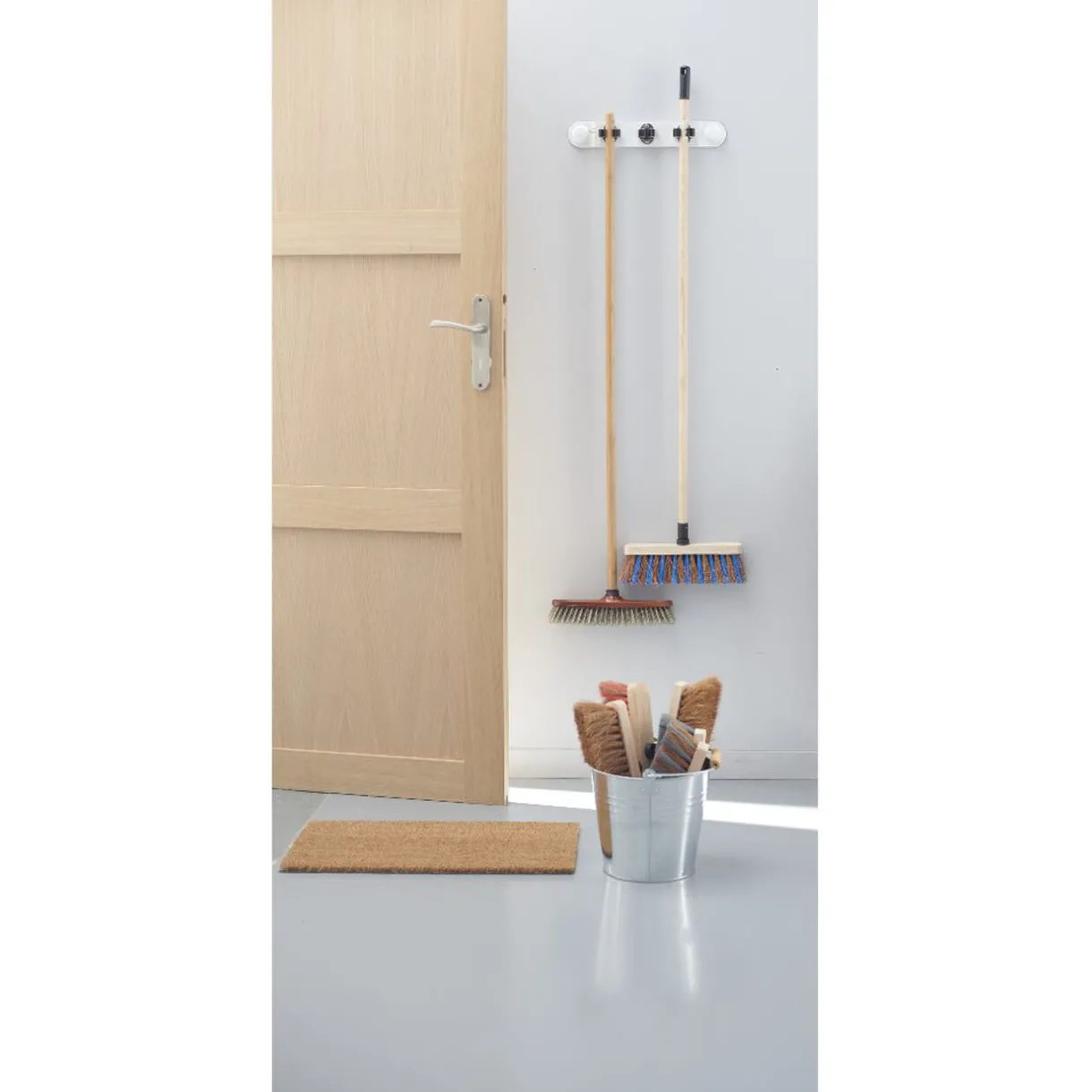 Rangez jusqu’à 3 balais sur cette accroche blanche à ventouses resserrables.
