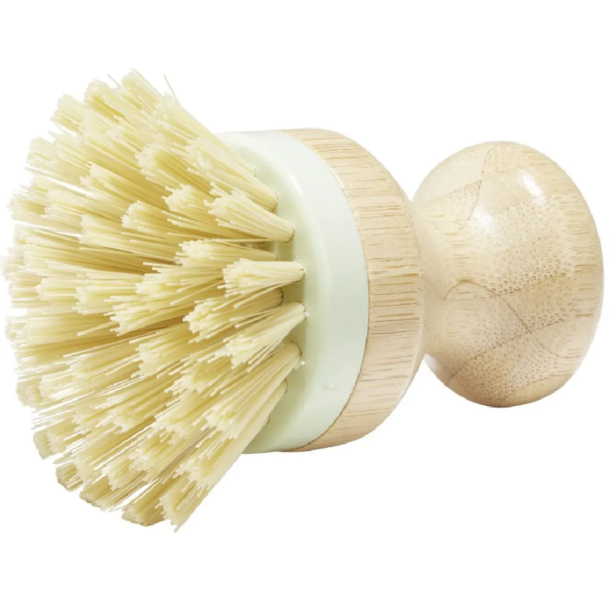 Brosse ronde à main pour vaisselle avec manche en bambou.