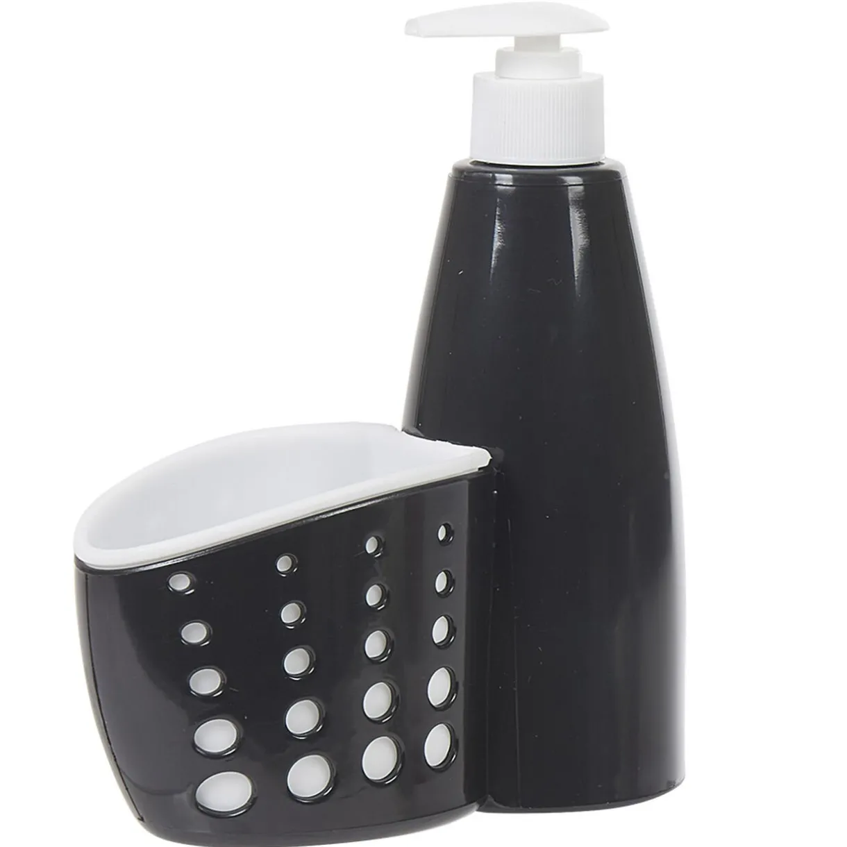 Très pratique et décoratif, ce distributeur de liquide vaisselle rechargeable noir et blanc avec compartiment à éponge fera tout son effet dans la cuisine sur le rebord de votre évier.