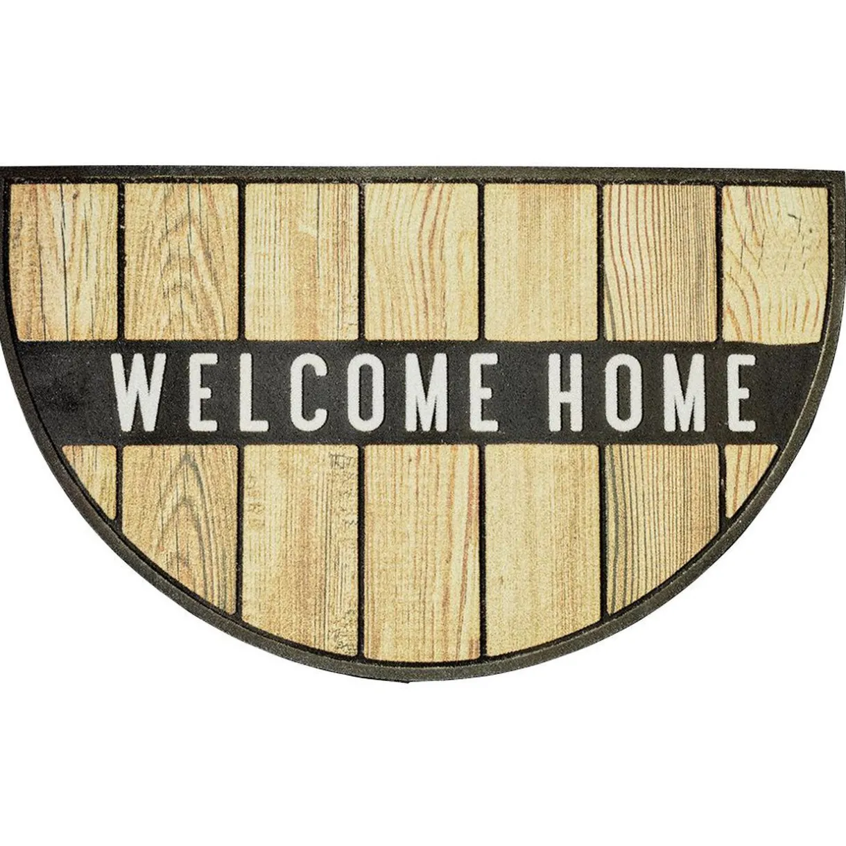 Paillasson demi-lune antidérapant et grattant effet bois avec inscription « Welcome Home » en noir et blanc. Idéal pour une entrée extérieure abritée pour souhaiter la bienvenue à vos invités.