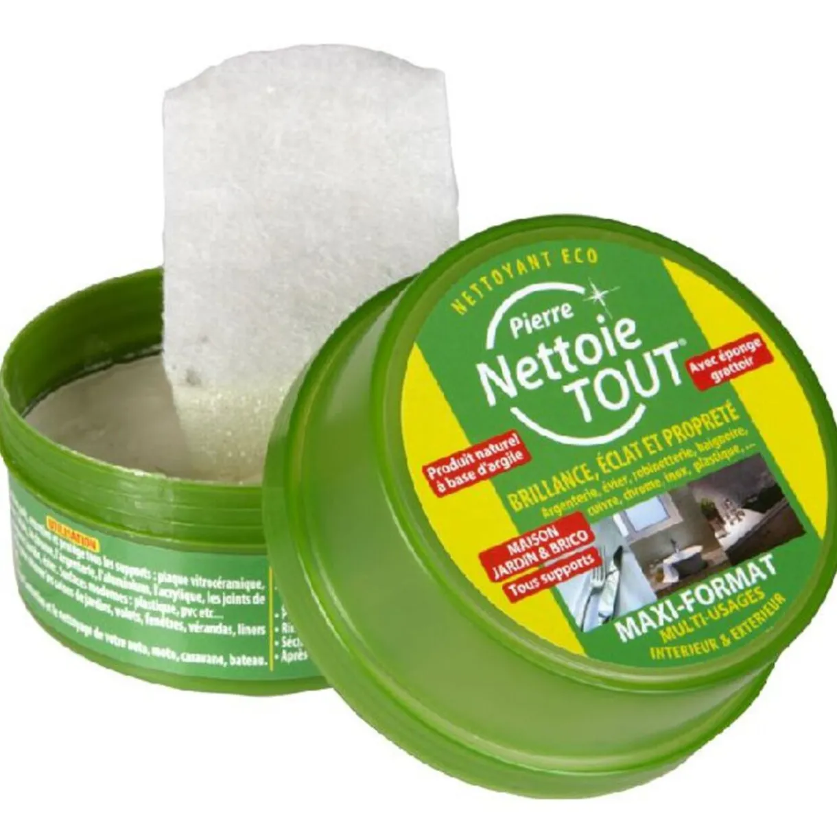 Produit naturel à base d’argile, d’une contenance de 300 gr.A l’intérieur, cette pierre nettoie, polit, entretient et protège tous les supports tels que le cuivre, l’inox, le chrome, l’aluminium, les joints de carrelage, le lavabo, le plastique, le PVC…A l’extérieur, elle nettoie les volets, les fenêtres, les vérandas, les liners de piscines…Au niveau bricolage, elle entretient et nettoie les motos, caravanes, automobiles, bateau…Concernant l’utilisation, humidifier l’éponge, puis l’imprégner de la pierre jusqu’à l’apparition de la mousse. Frotter sur les surfaces à nettoyer, rincer à l’eau claire et sécher avec un chiffon propre, doux. Après utilisation, laisser sécher la pierre avant fermeture du pot.Pot de 10 cm de diamètre.
