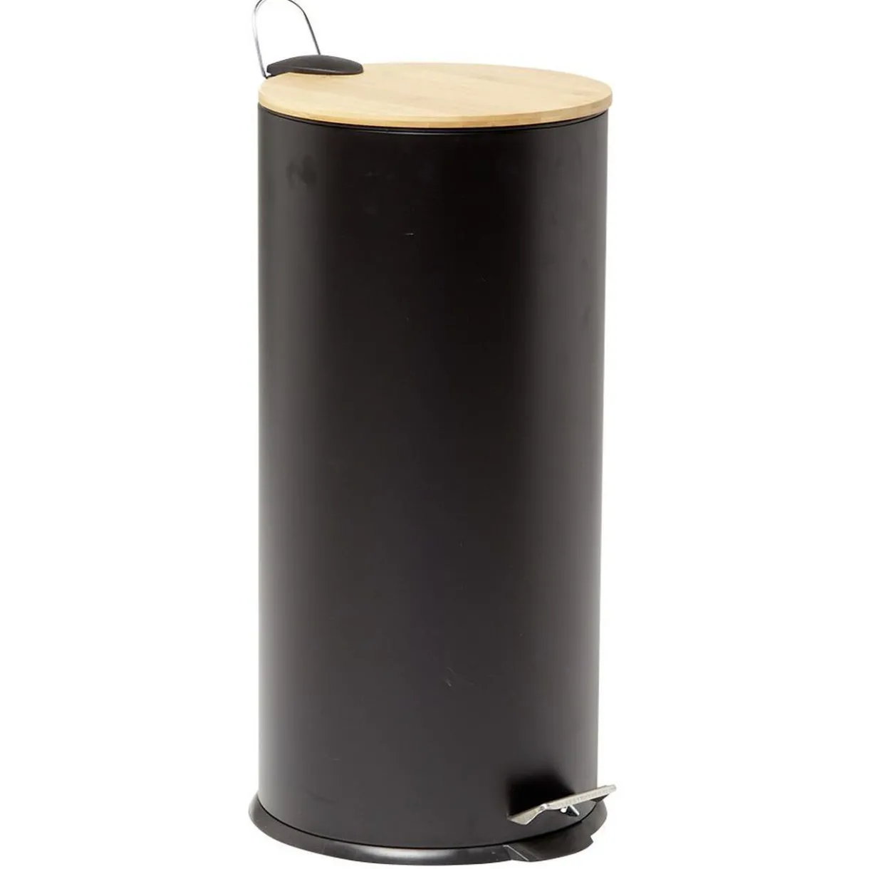 Cette poubelle à pédale ronde en métal noir est dotée d’un seau intérieur et se ferme avec un joli couvercle en bambou naturel.