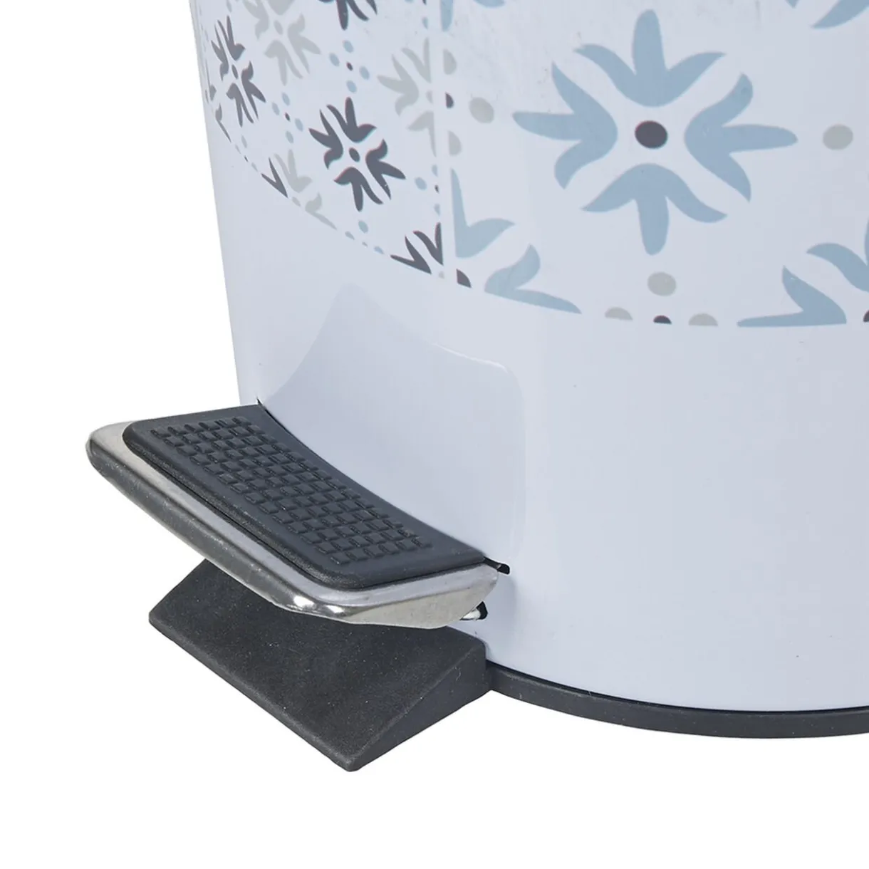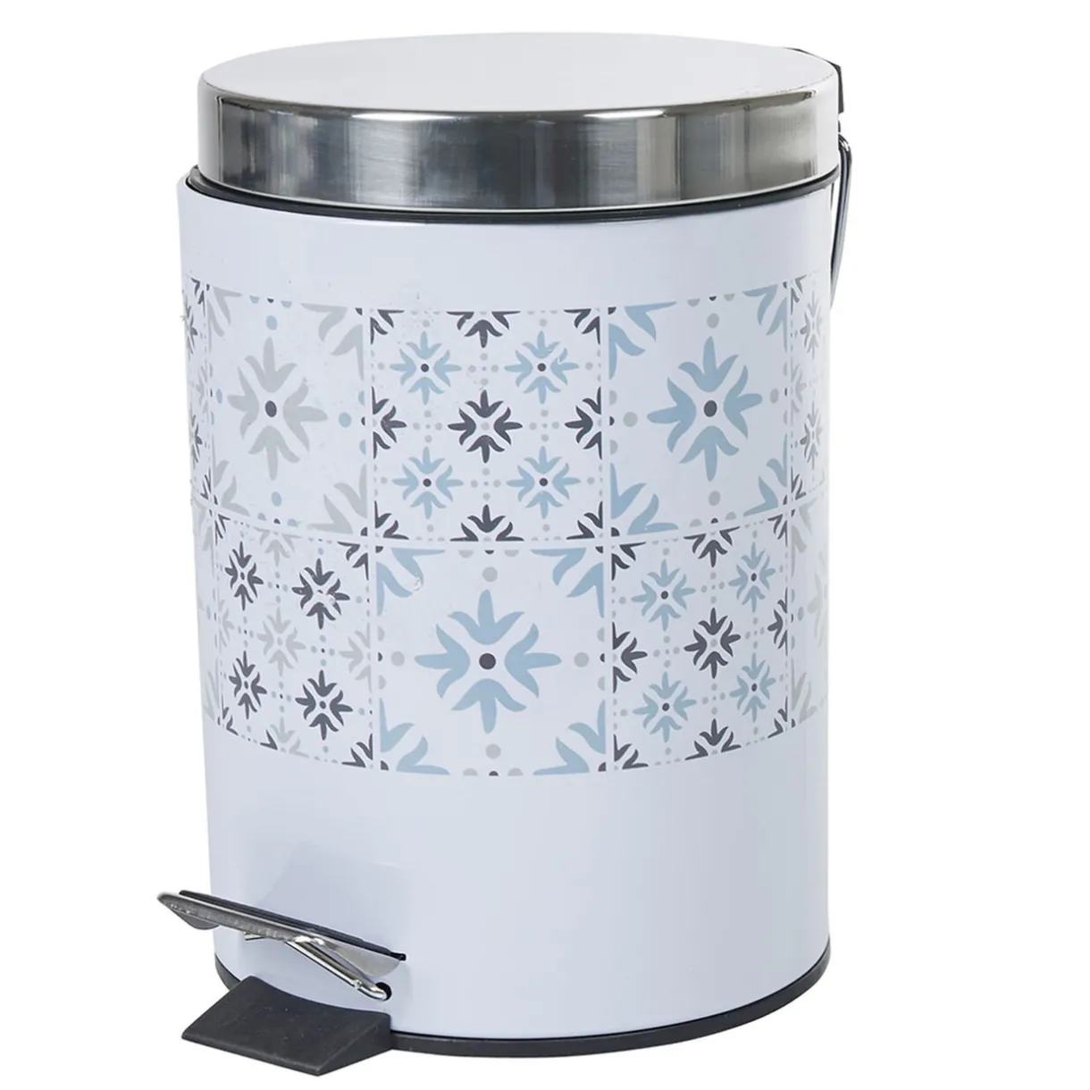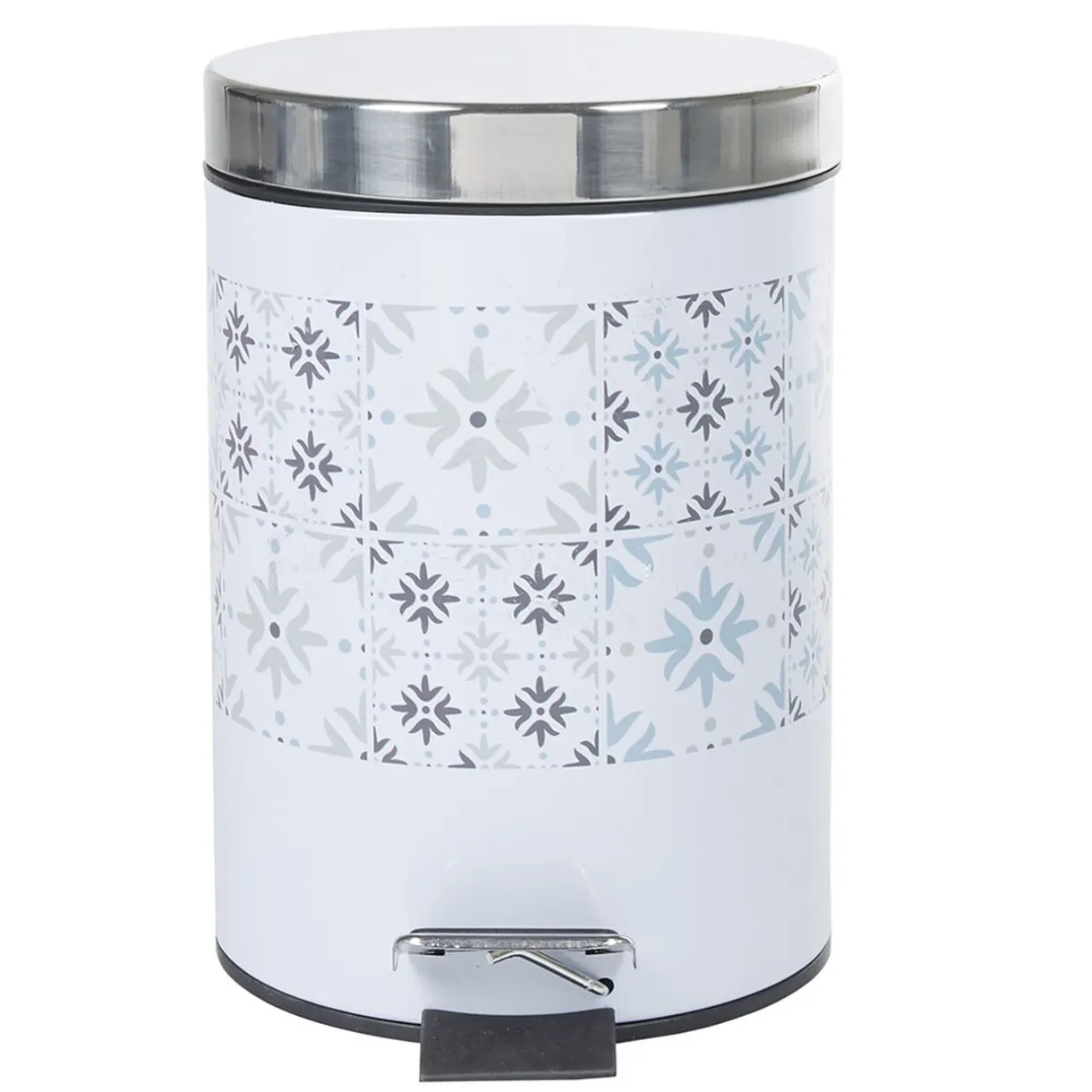 Poubelle de salle de bain en métal blanc design carreau de ciment beige/bleu/gris.