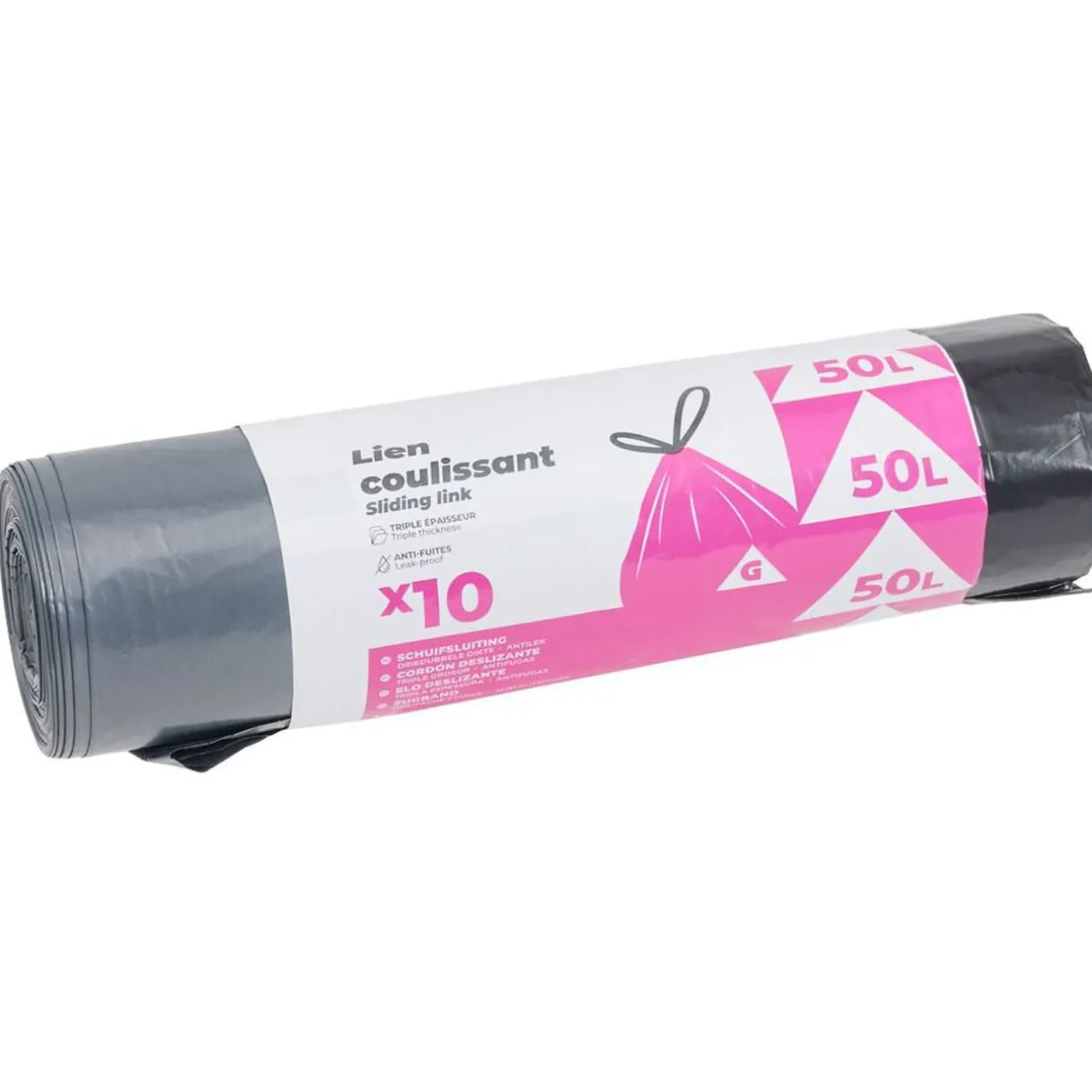Lot de 10 sacs poubelles noirs de 50L avec lien de fermeture coulissant.