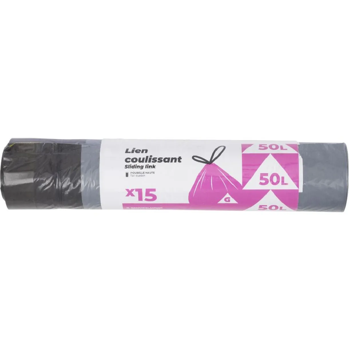 Lot de 15 sacs poubelles noirs de 50L avec lien de fermeture coulissant.