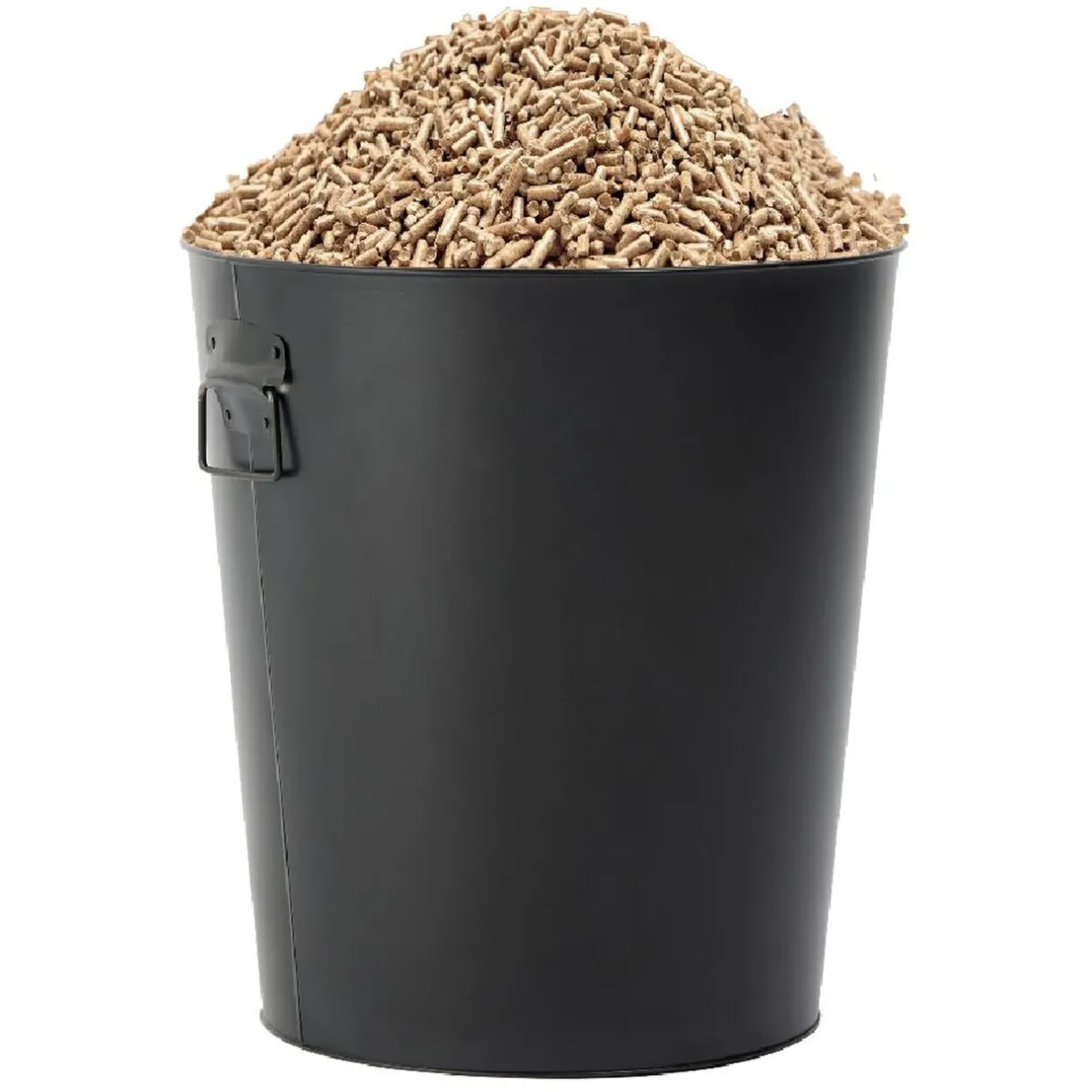 Seau en acier noir pour stocker et déplacer vos pellets ou granulés de bois près du poêle.