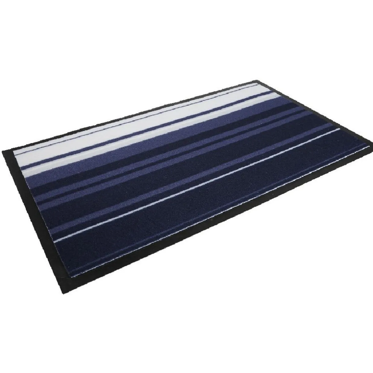 Optez pour ce tapis de cuisine bayadère aux couleurs blanc, bleu et violet avec contour noir !