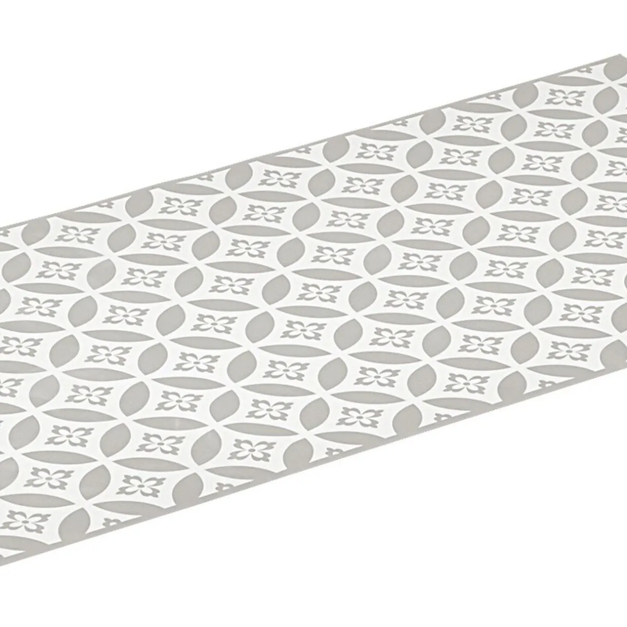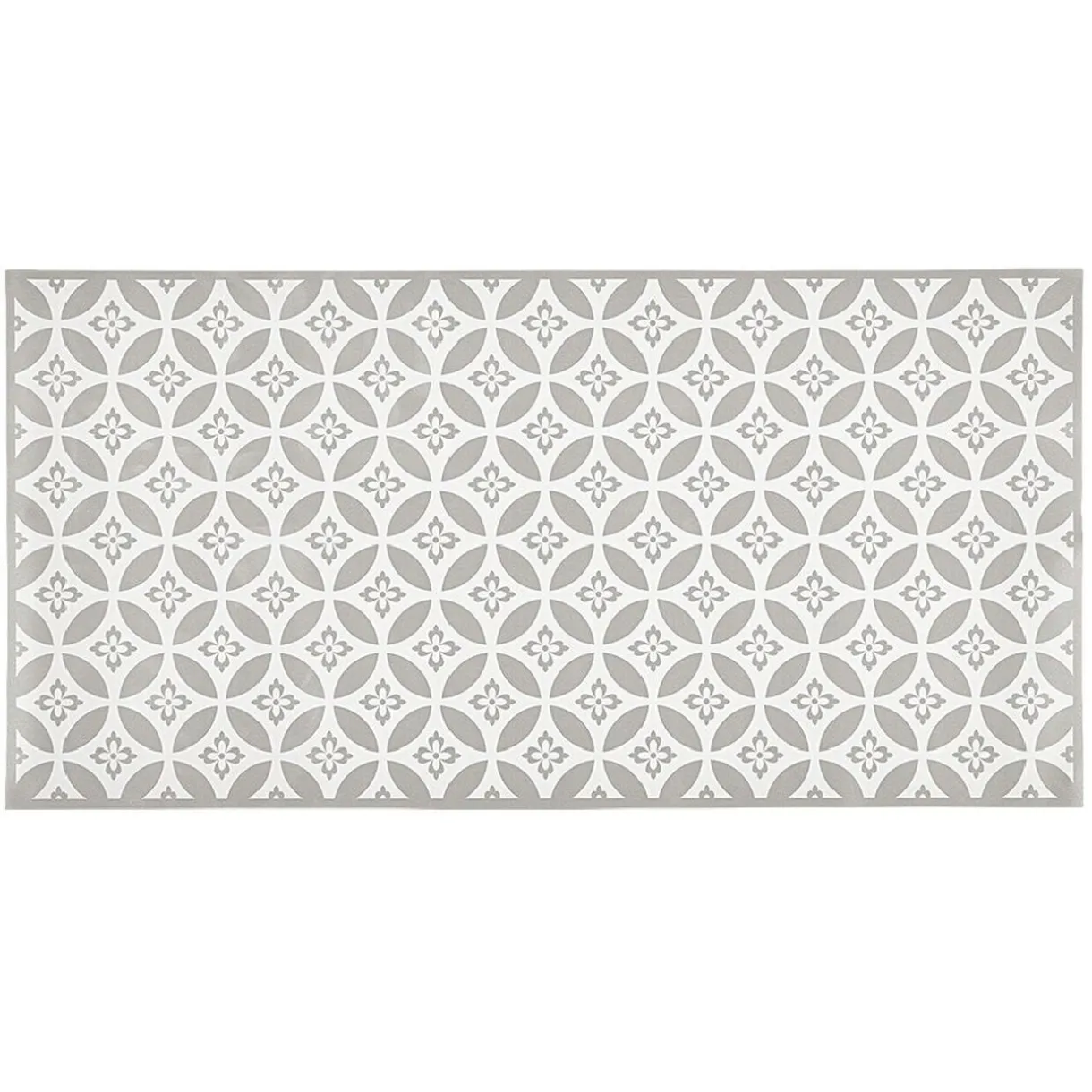 Tapis de cuisine en vinyle rectangulaire imprimé rosace blanc et gris.