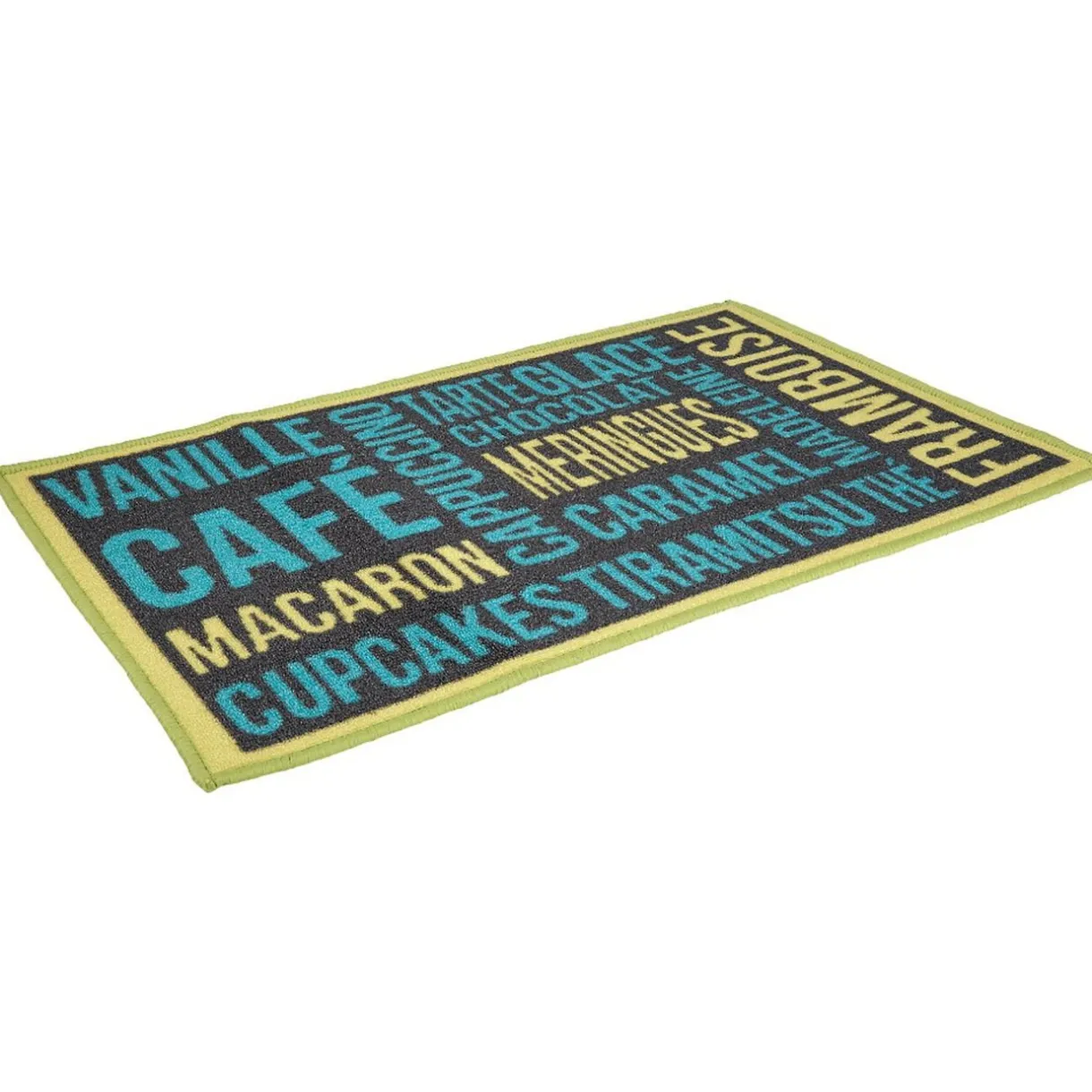 Tapis de cuisine design avec inscription sur le thème de la gourmandise : meringues, caramel, cupcakes, etc.