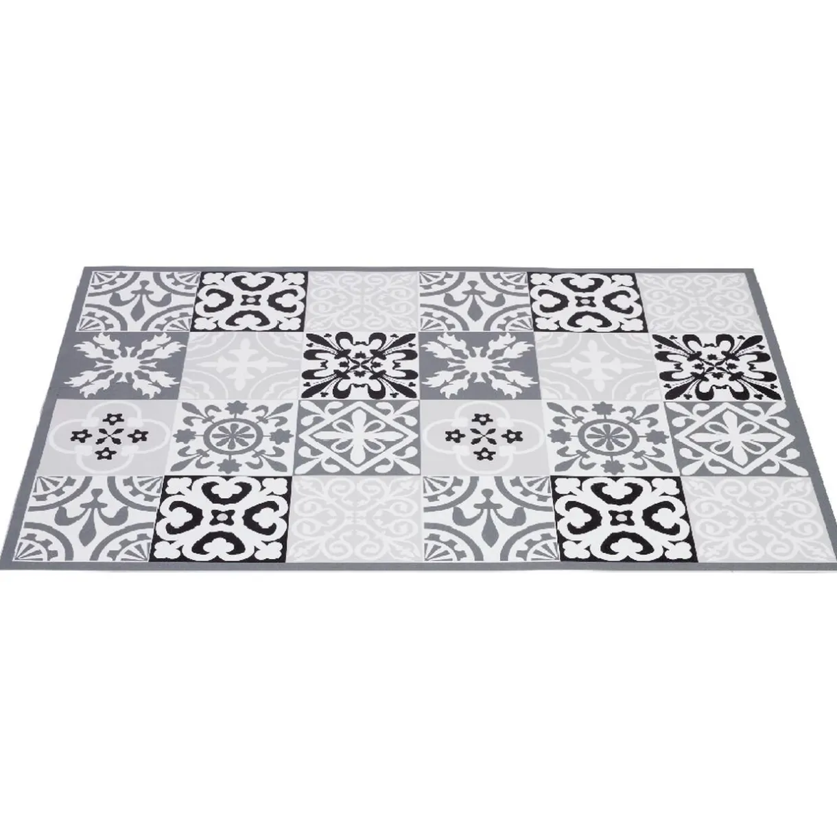 Tapis de cuisine rectangulaire en vinyle imprimé carreau de ciment noir et gris.