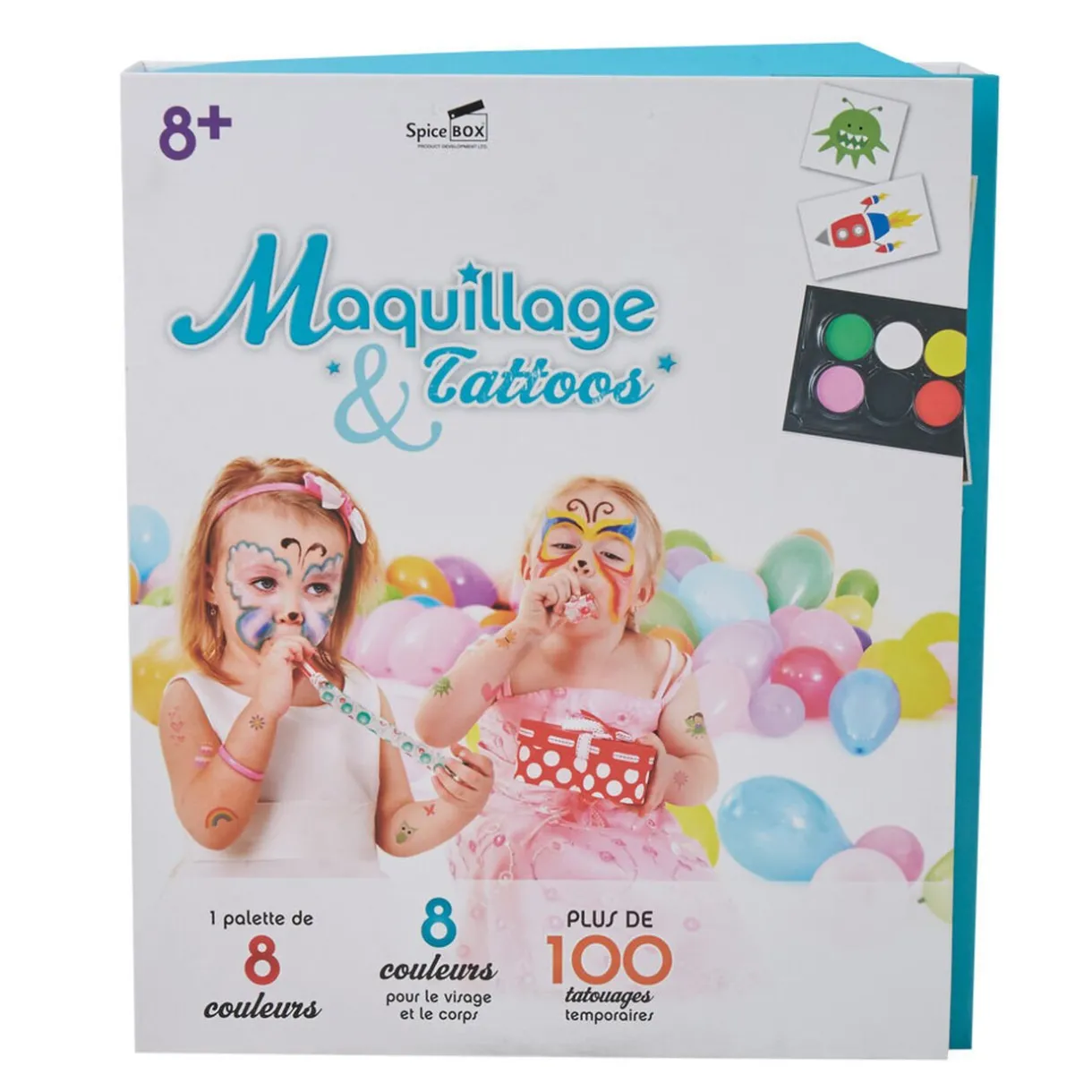 Coffret maquillage et tatoos comprenant 1 palette de 8 couleurs, 8 couleurs pour visage et corps, plus de 100 tatoos temporaires, 2 pinceaux et 2 éponges.