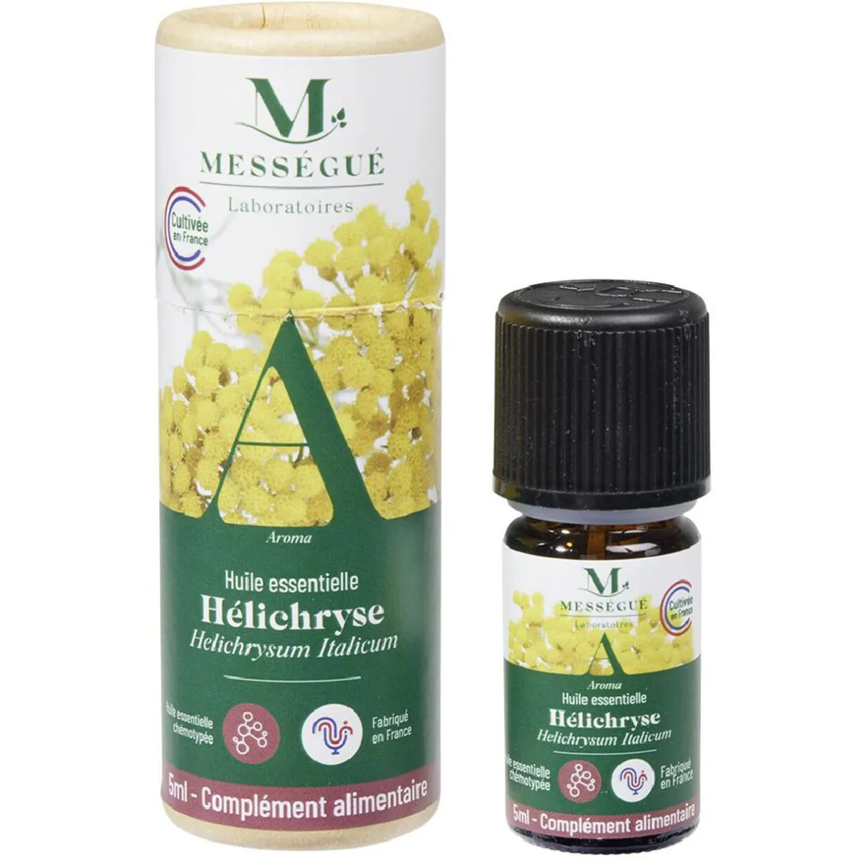 Huile essentielle d’hélichryse dans son flacon en verre ambré avec compte-gouttes et sécurité enfant.