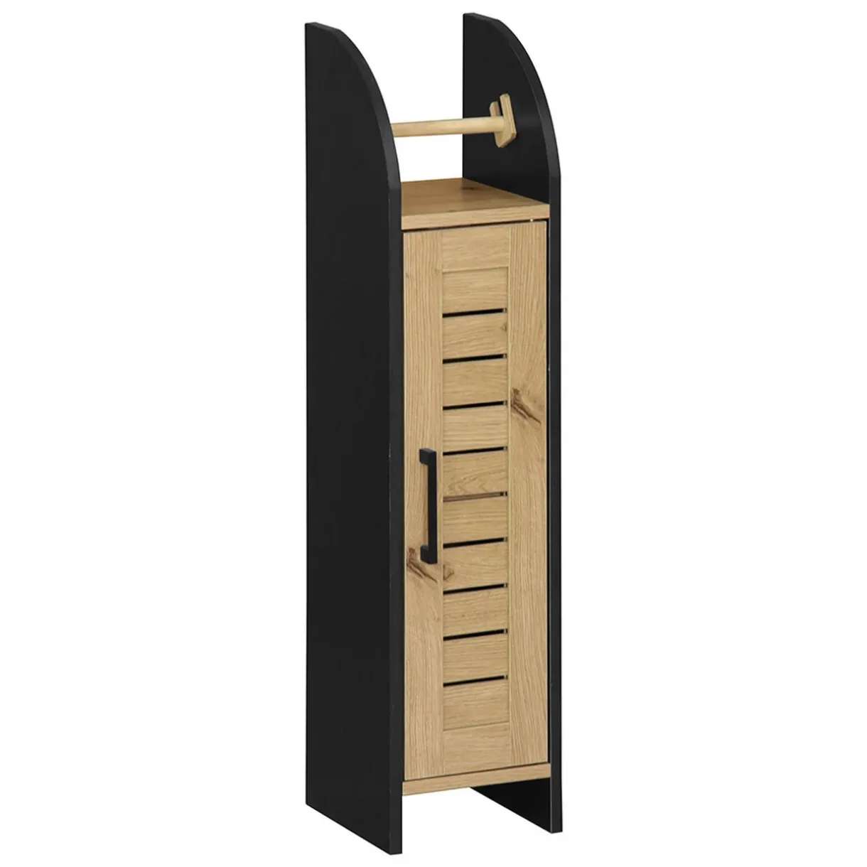 Meuble de rangement pour WC à 1 porte avec porte-rouleau papier toilette. Fonctionnel et esthétique avec son design marron et noir et sa jolie porte habillée de lattes horizontales, ce meuble de la gamme Richmond s’intègrera aisément dans tous les décors.