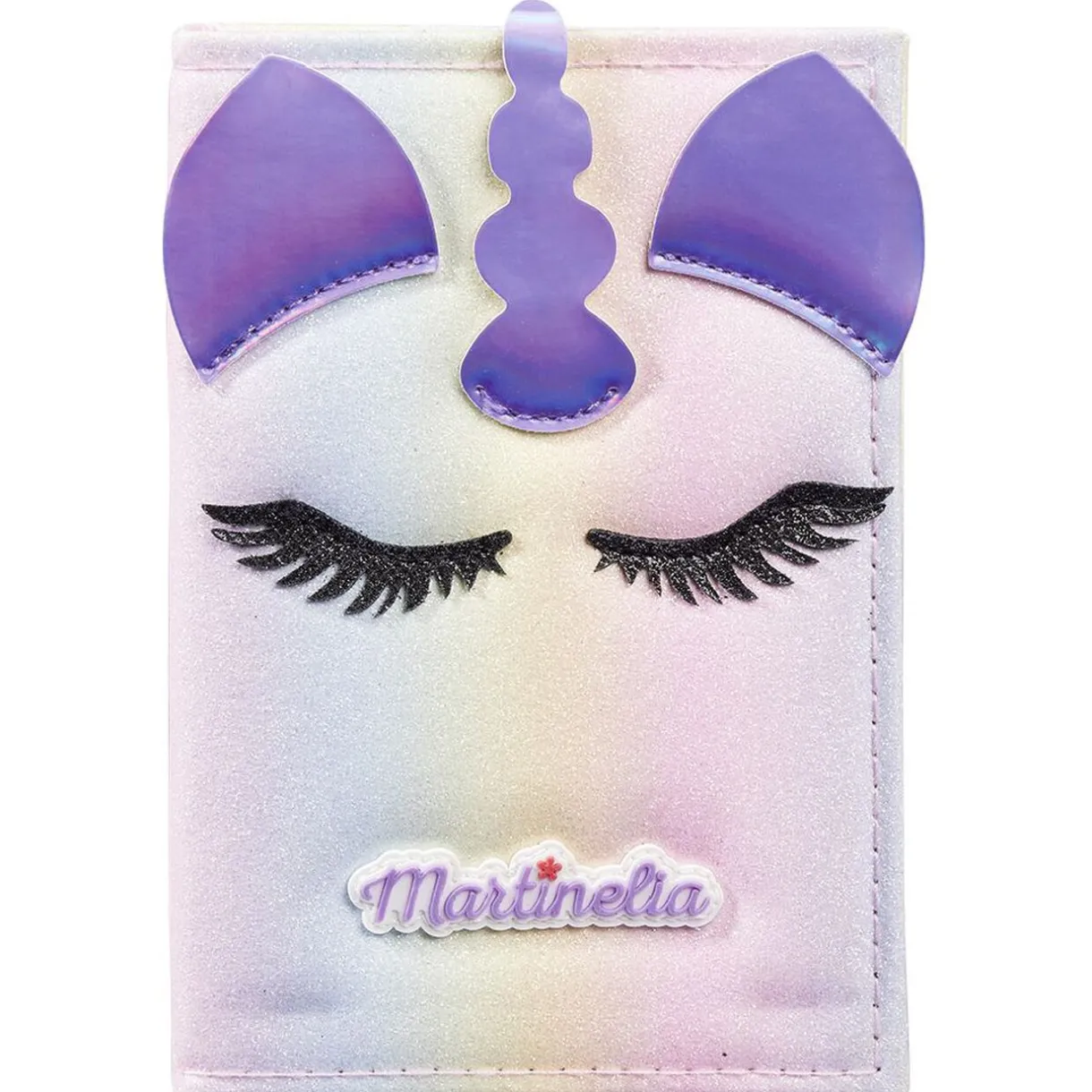 Palette à maquillage Martinelia en forme de livre design licorne composée de 29 ombres à paupières, 8 rouges à lèvres, 4 fards à joues, 4 poudres fond de teint et 3 applicateurs. Le kit idéal pour se pomponner !