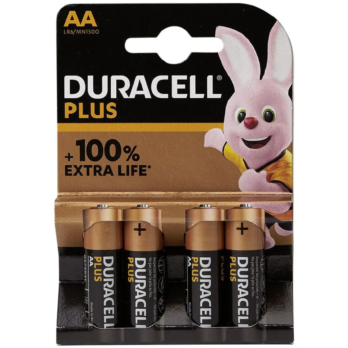 Lot de 4 piles Duracell PLUS 100% AA. Durent jusqu’à 100% plus longtemps.