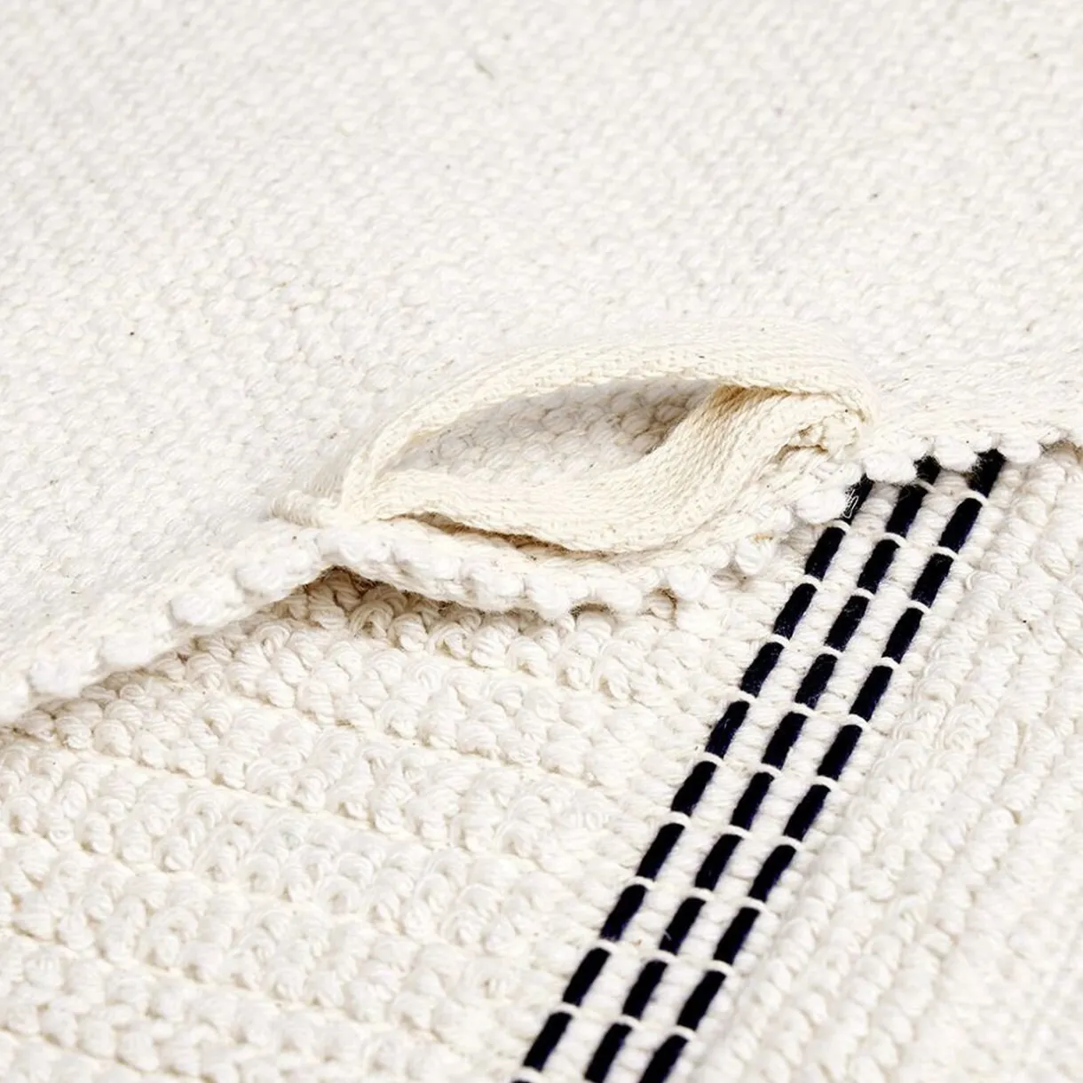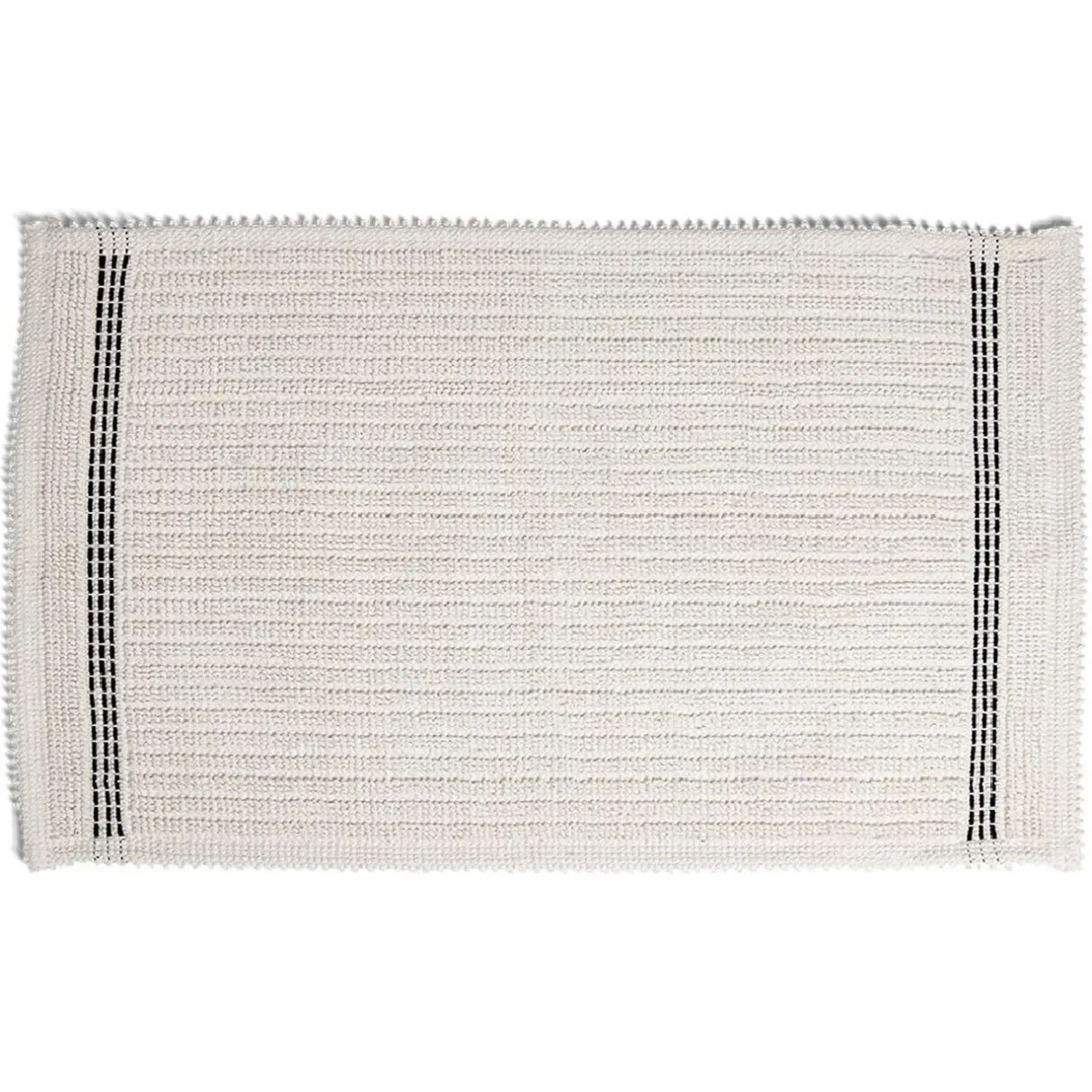 Ce tapis de bain 100% coton tissé blanc avec liseré noir est idéal pour une sortie de douche au sec.