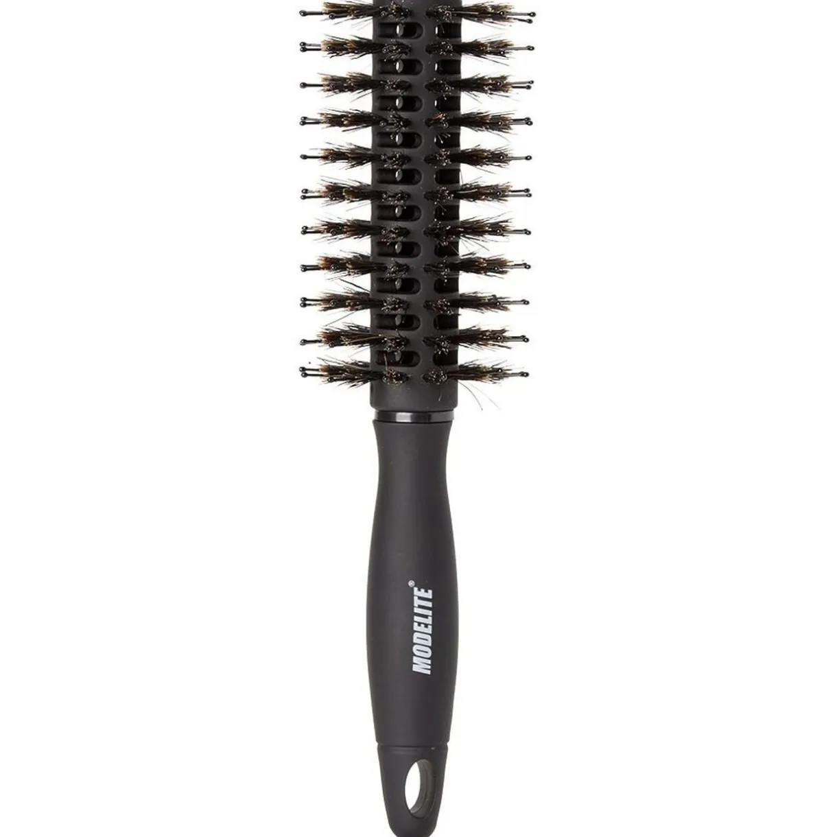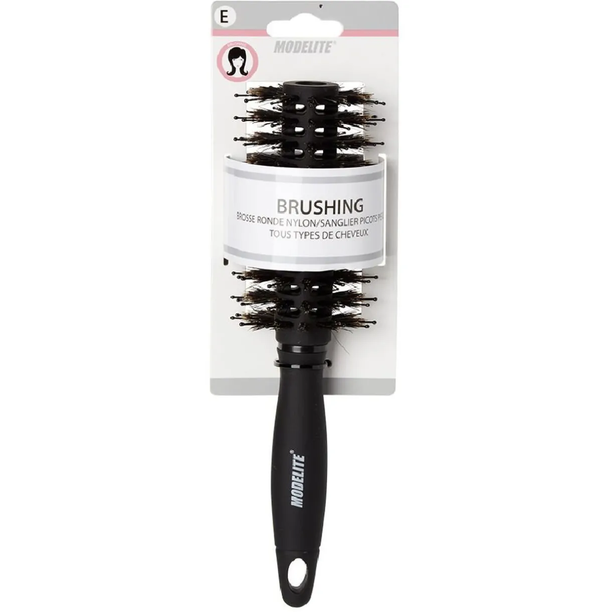 Brosse à brushing en pvc avec picots en nylon et poils de sanglier perlés.