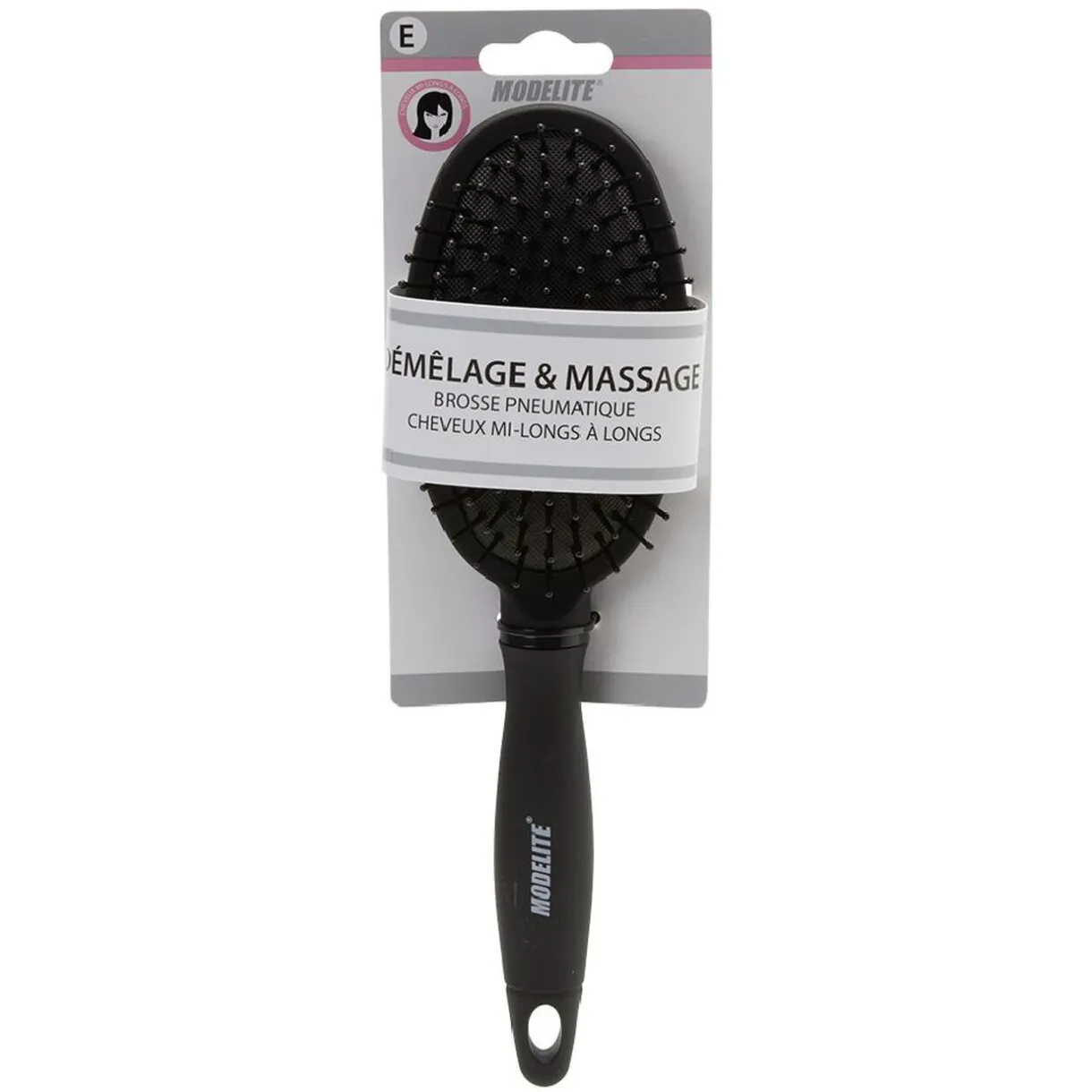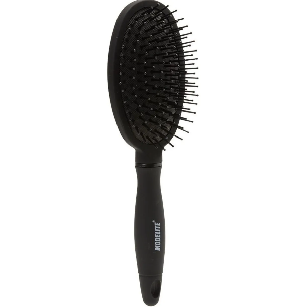 Brosse pneumatique ovale avec picots en pvc noir perlés. Idéale pour masser délicatement le cuir chevelu lors du démêlage et du coiffage.