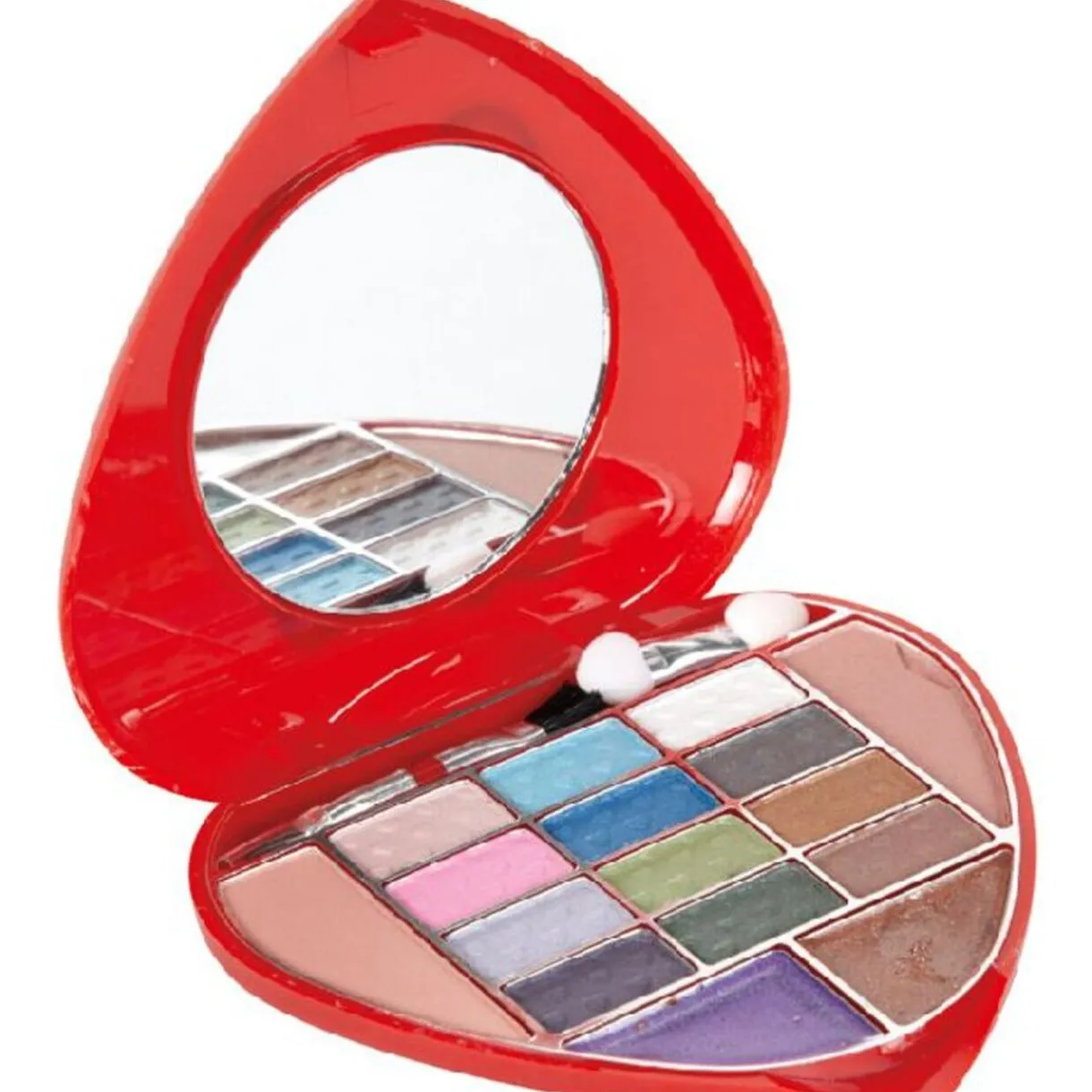 Palette maquillage « Hello Kitty », dim. 11×10 cm,Comprend : 1 miroir Ø 6 cm, 12 fards à paupières, 2 blush, 2 gloss et 2 pinceaux applicateurs.Voir la collection complète des produits .