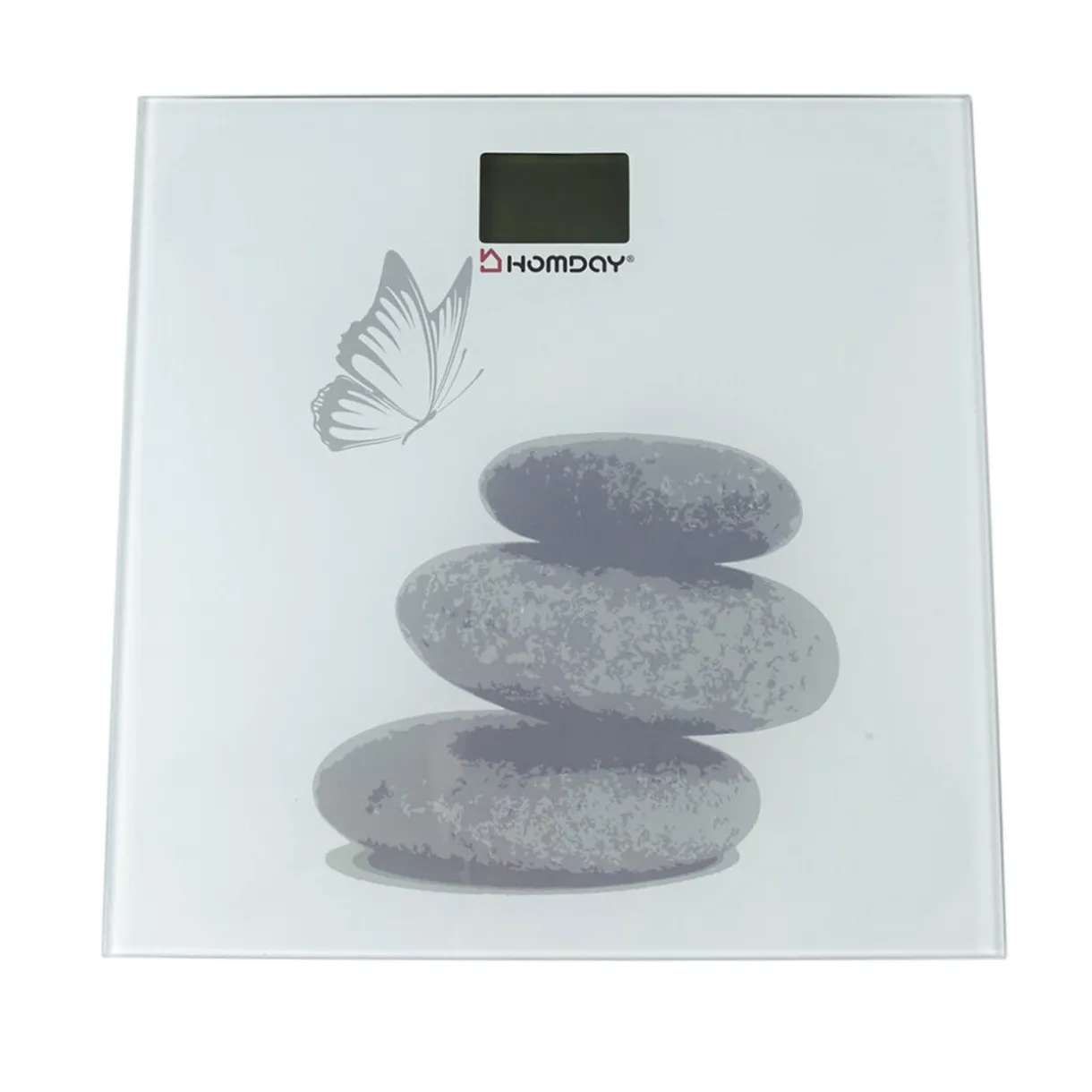 Pèse personne design galets Homday, dim. 26x26x1,6 cm, verre et plastique. Poids maximum 150 kgs, écran LCD, indicateur de batterie faible. Fonctionne avec 1 pile CR2032. Garantie 2 ans..