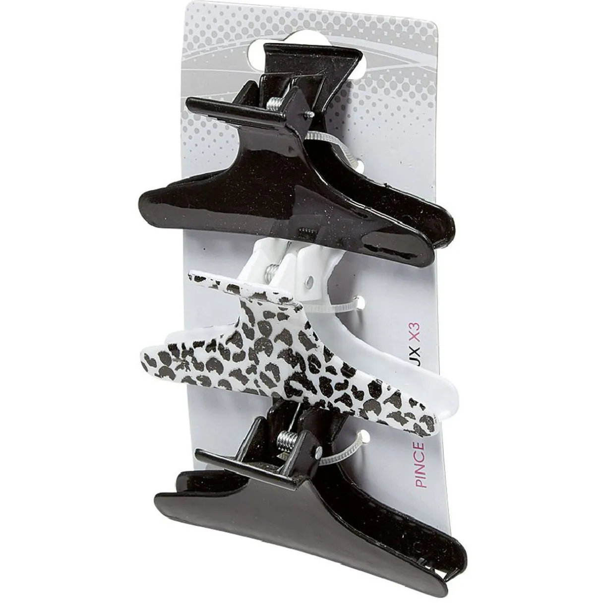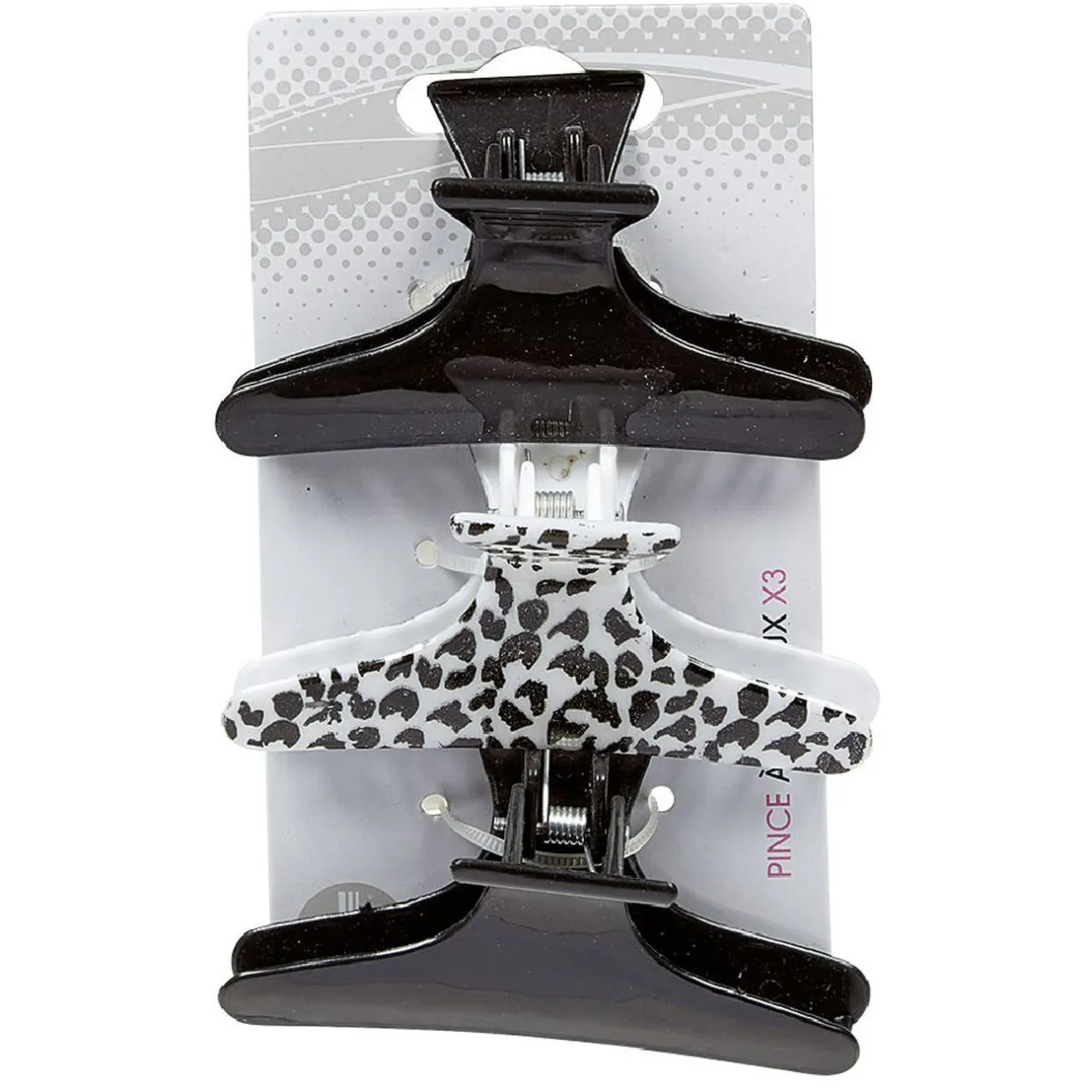 Lot de 3 pinces à cheveux en plastique (2x uni noir et 1x décor léopard).