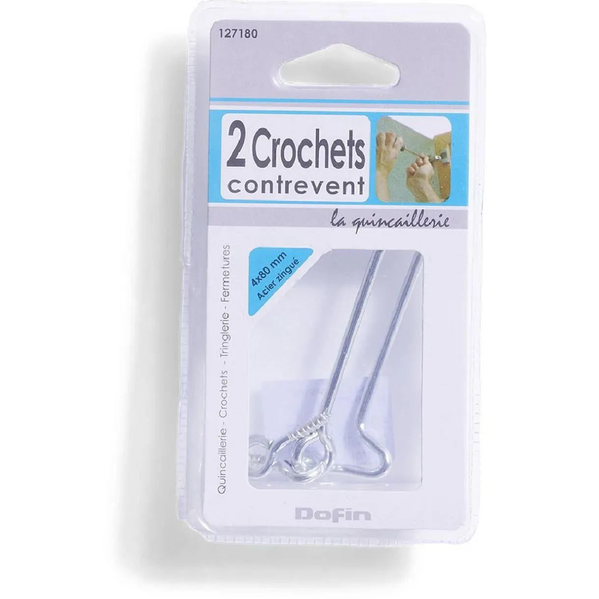Lot de 2 crochets de contrevent en acier zingué à visser pour fermeture de volet battant.