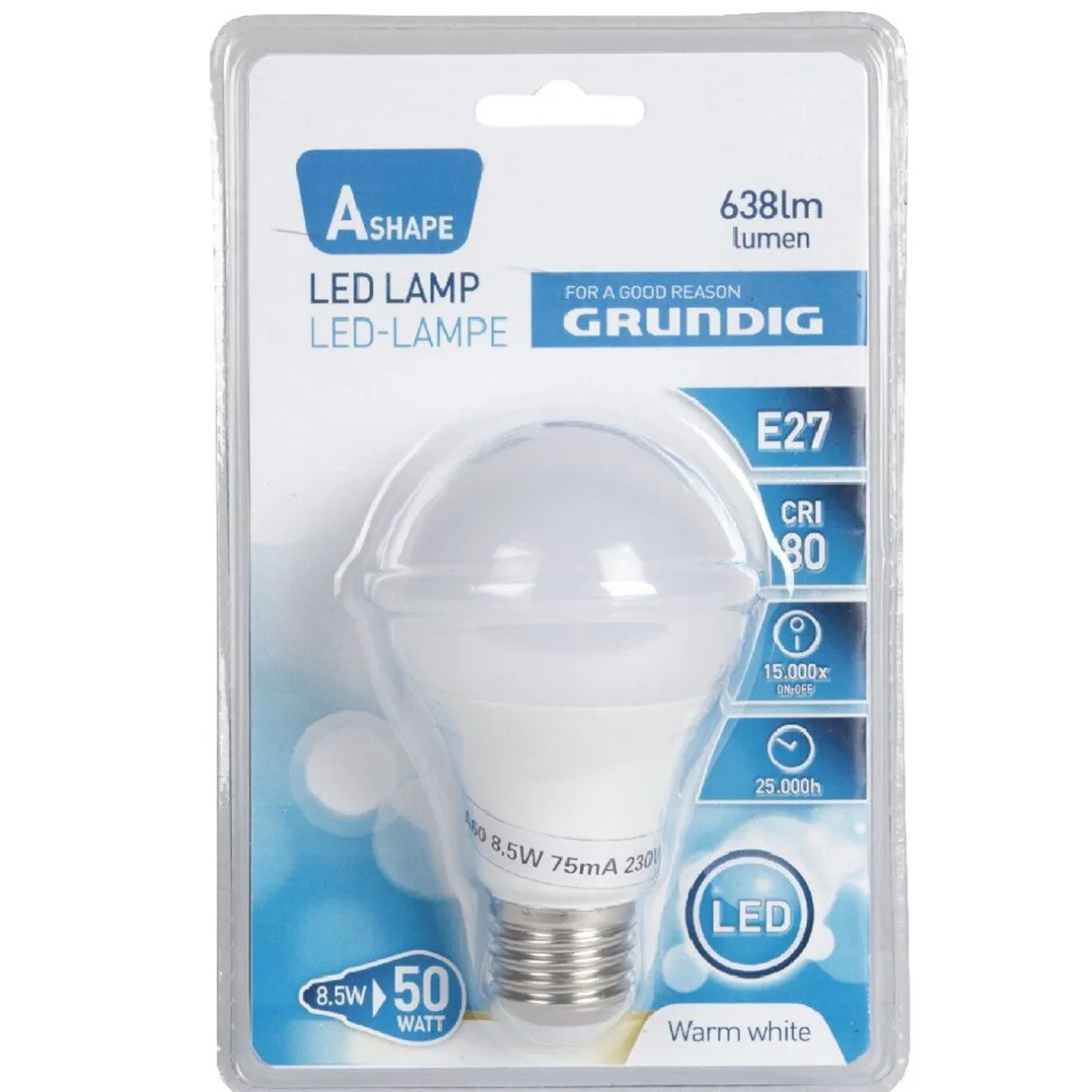 Ampoule led A60 Grundig, 8 W (50 W), E 27, CRI 80, 30 000 heures, 680 lumen. Dim. 10,8×6 cm, verre…