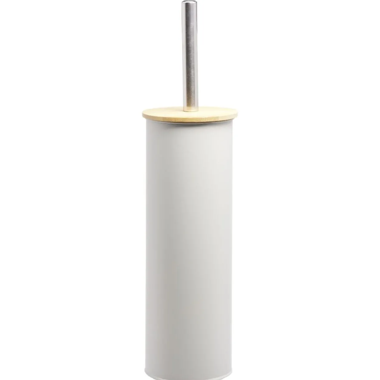Brosse WC dans son pot cylindrique en métal avec couvercle en bambou naturel.