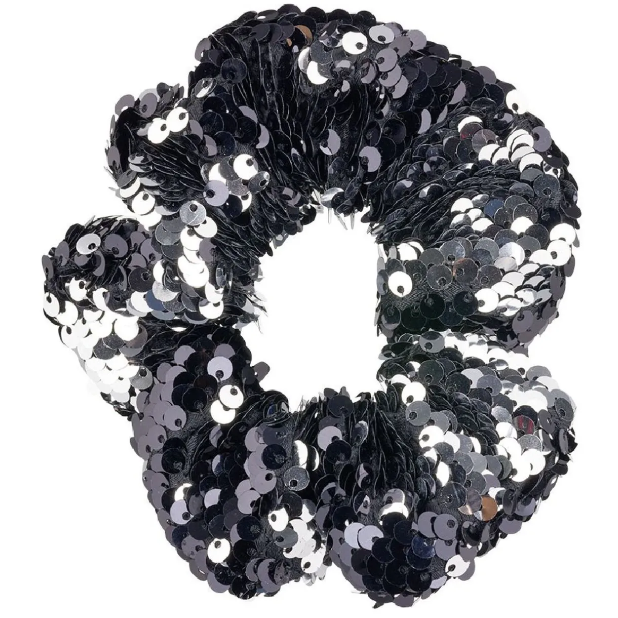 Chouchou en polyester décoré de sequins noirs et argentés.