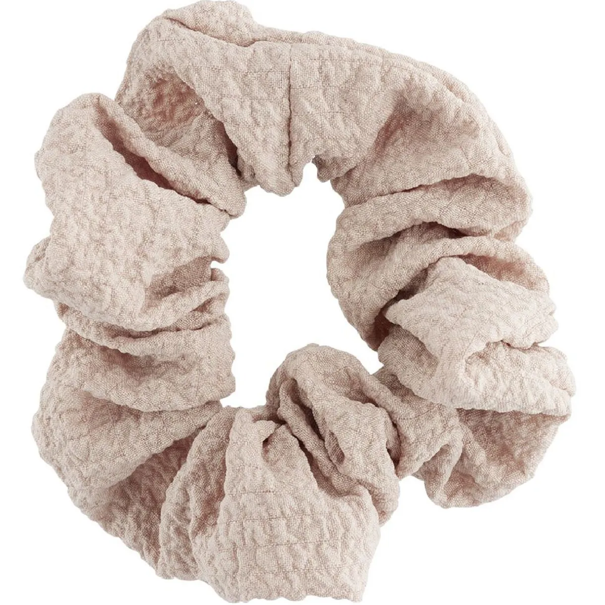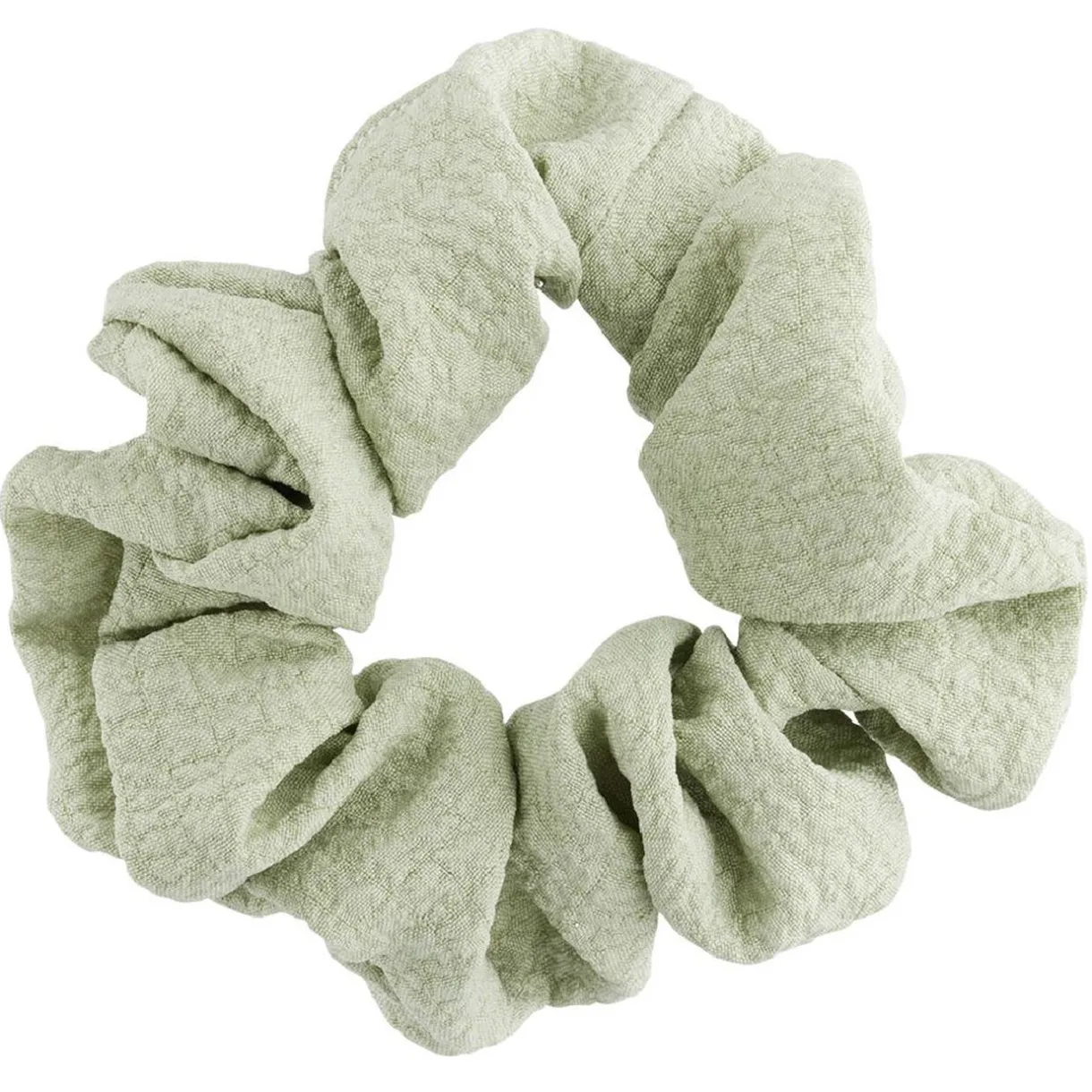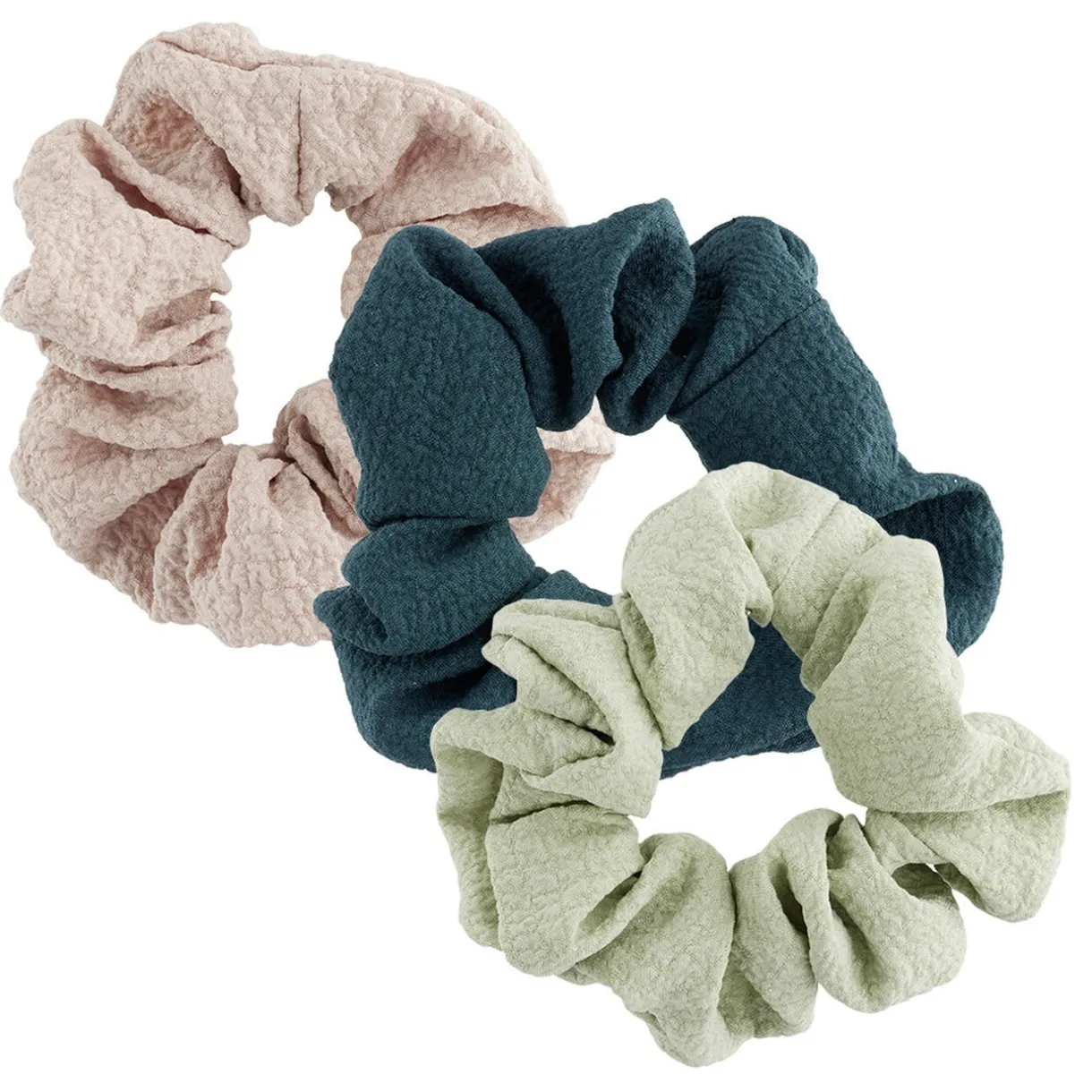Lot de 3 chouchous en gaze de coton vert clair, vert foncé et rose.