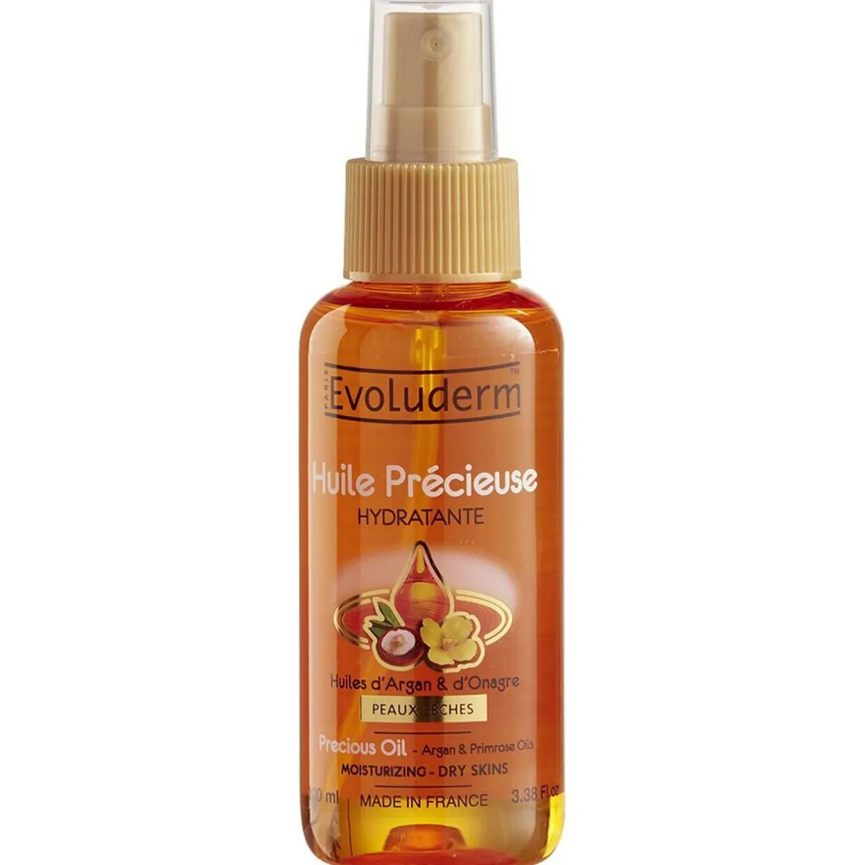 Huile précieuse Evoluderm aux huiles huile d’argan et d’onagre reconnus pour leurs vertus hydratantes et protectrices. Idéale pour les peaux sèches.