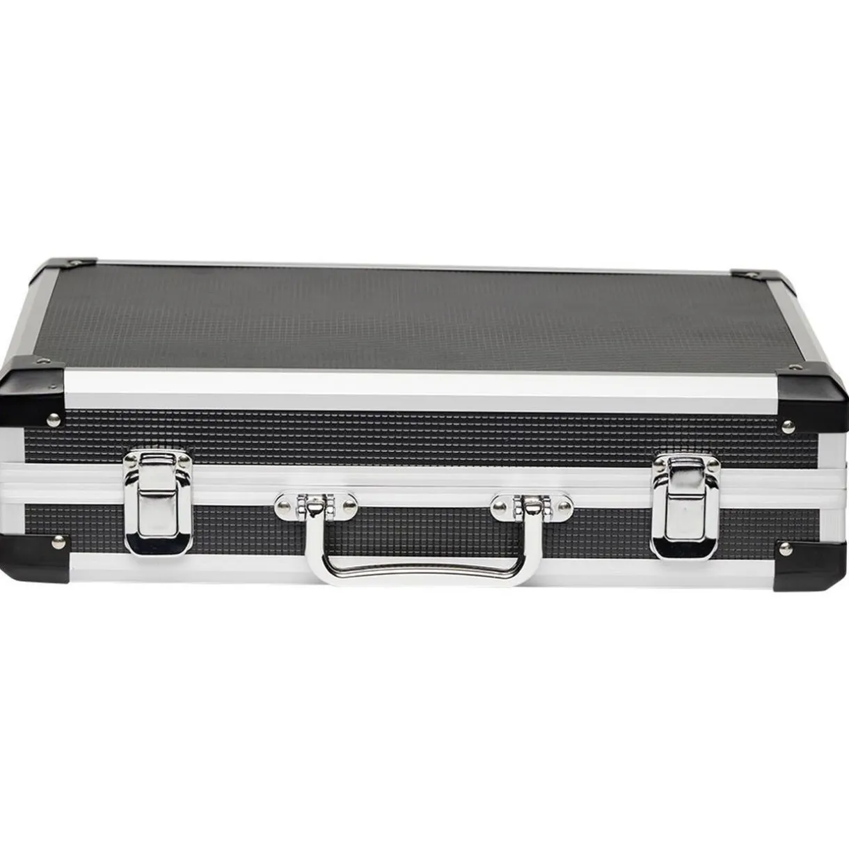 Mallette de mécanicien en aluminium incluant 125 pièces dont 6 clés mixtes, 4 tournevis, 1 tournevis porte-embout, 1 pince multiprise, 1 clé à molette, 1 clé à cliquet, 25 douilles, 56 embouts, 16 clés hexagonales, 2 barres d’extension, 1 barre en T coulissante, 10 serre-câbles et 1 adaptateur.