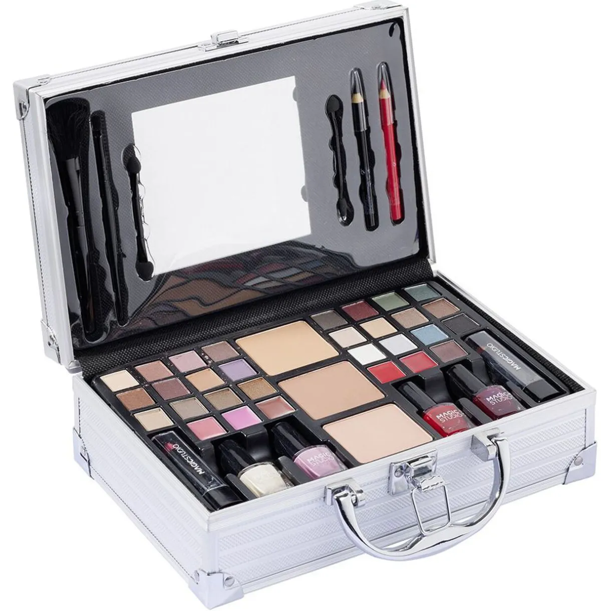 Mallette de maquillage se composant de 24 fards à paupière, 6 rouges à lèvre, 3 blush et bronzer, 1 crayon yeux, 1 crayon à lèvre, 1 pinceau applicateur