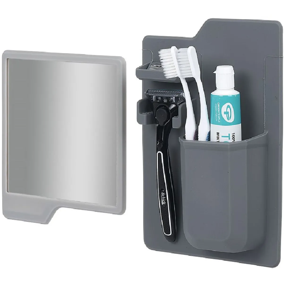 Organiseur pour salle de bain en silicone avec miroir, idéal pour accrocher rasoir, brosse à dent ou dentifrice.