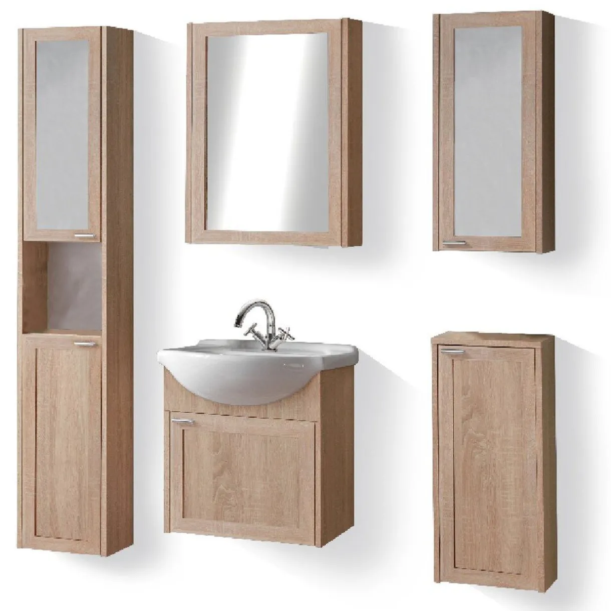 Avec les 5 modules de salle de bain Emma, faites de votre pièce un endroit agréable ! Composés d’un grand cabinet, qui vous permet de ranger certains de vos produits à l’abri des regards et d’en exposer d’autres, de ses deux plus petits cabinets, de son grand miroir et de son cabinet équipé d’un évier en céramique, ces 5 éléments peuvent être accrochés contre un mur. De cette façon, vous gagnerez de l’espace au sol et faciliterez l’entretien de votre salle de bain. La finition chêne sonoma de l’ensemble apportera lumière et chaleur à votre pièce. Pensez à disposer des plantes dans votre salle de bain afin d’en faire un endroit encore plus agréable.