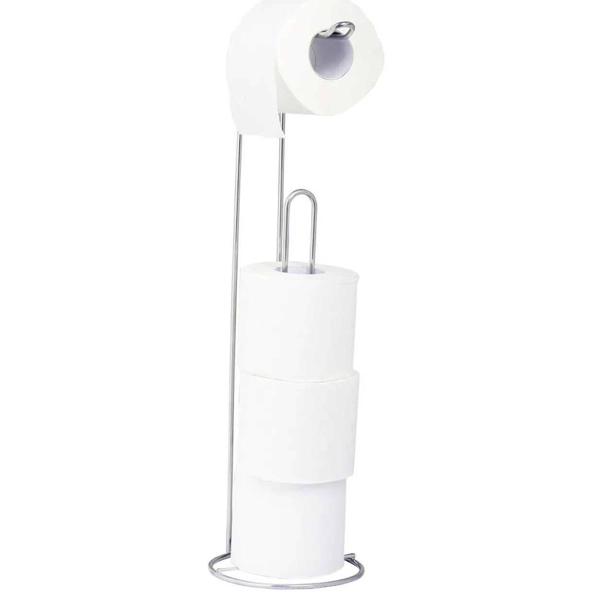 Dérouleur à papier toilette avec réserve pour rouleaux en métal gris.