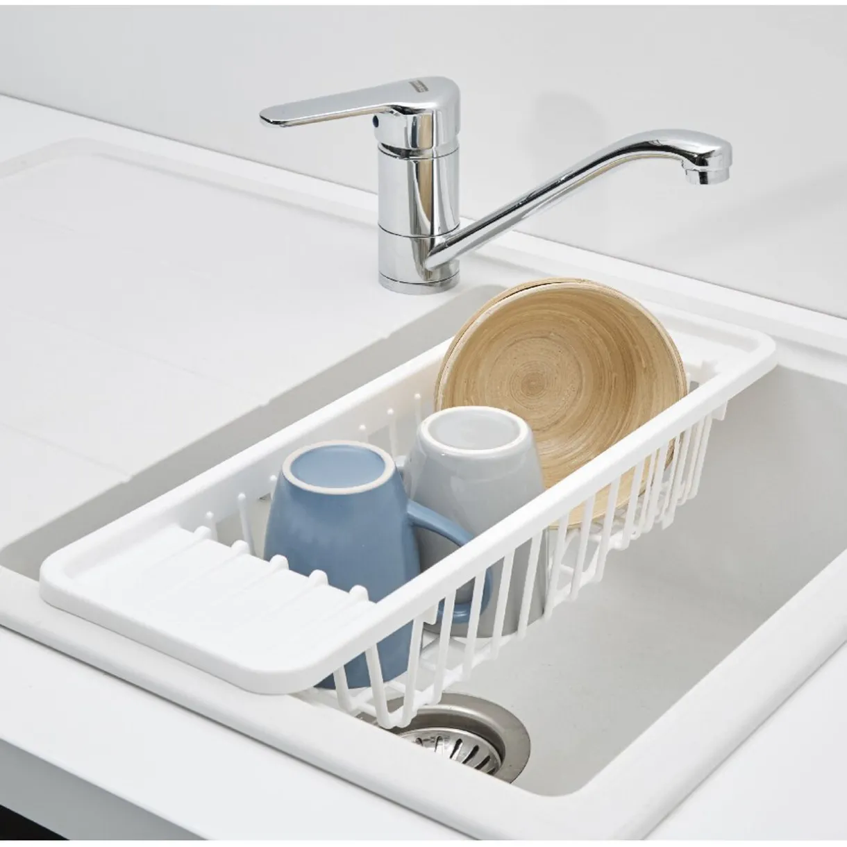 Passoire égouttoir 2 en 1 pour évier de couleur blanc.